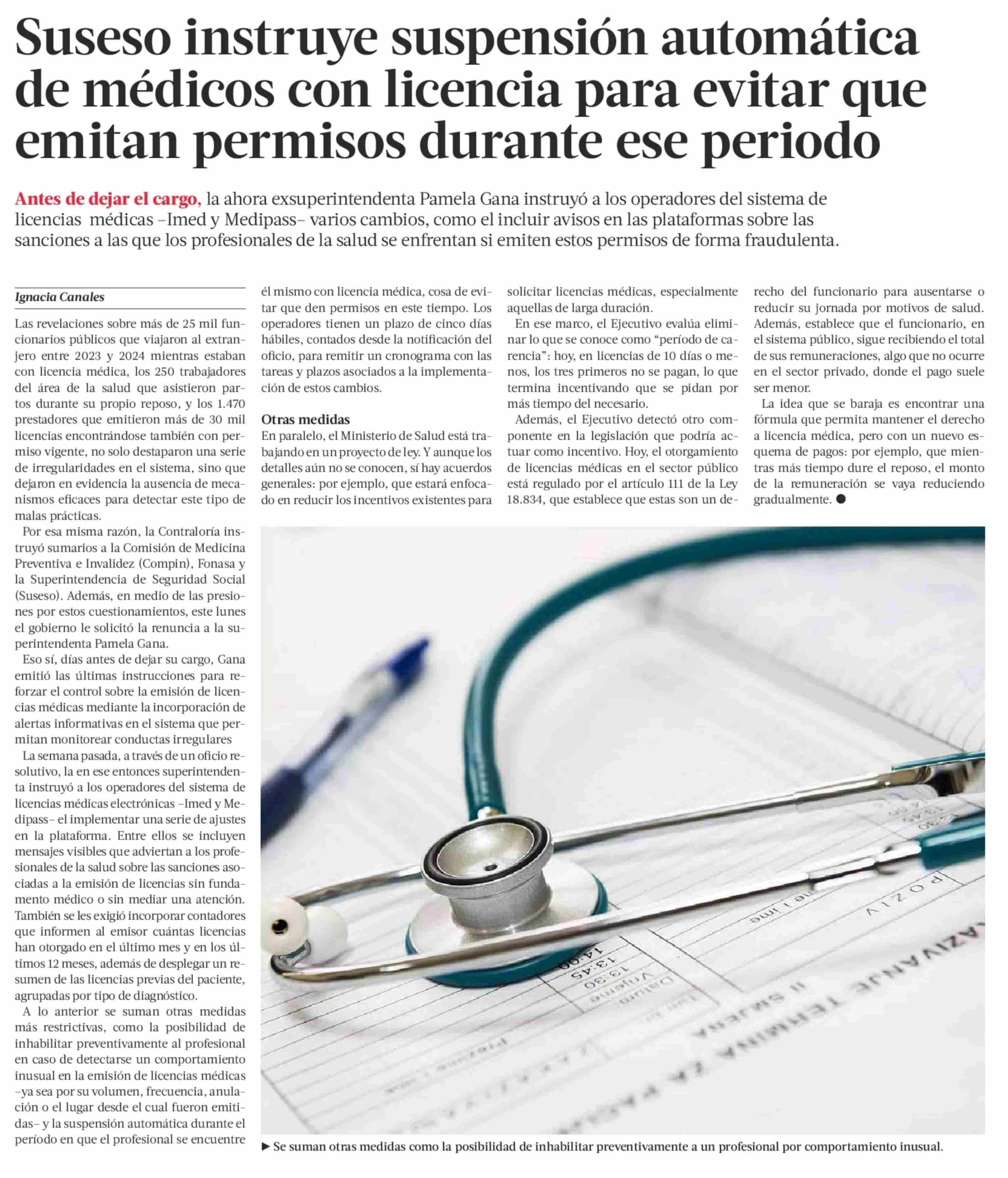 Suseso instruye suspensión automática de médicos con licencia para evitar que emitan permisos durante ese periodo 18-06-2025 La Tercera |