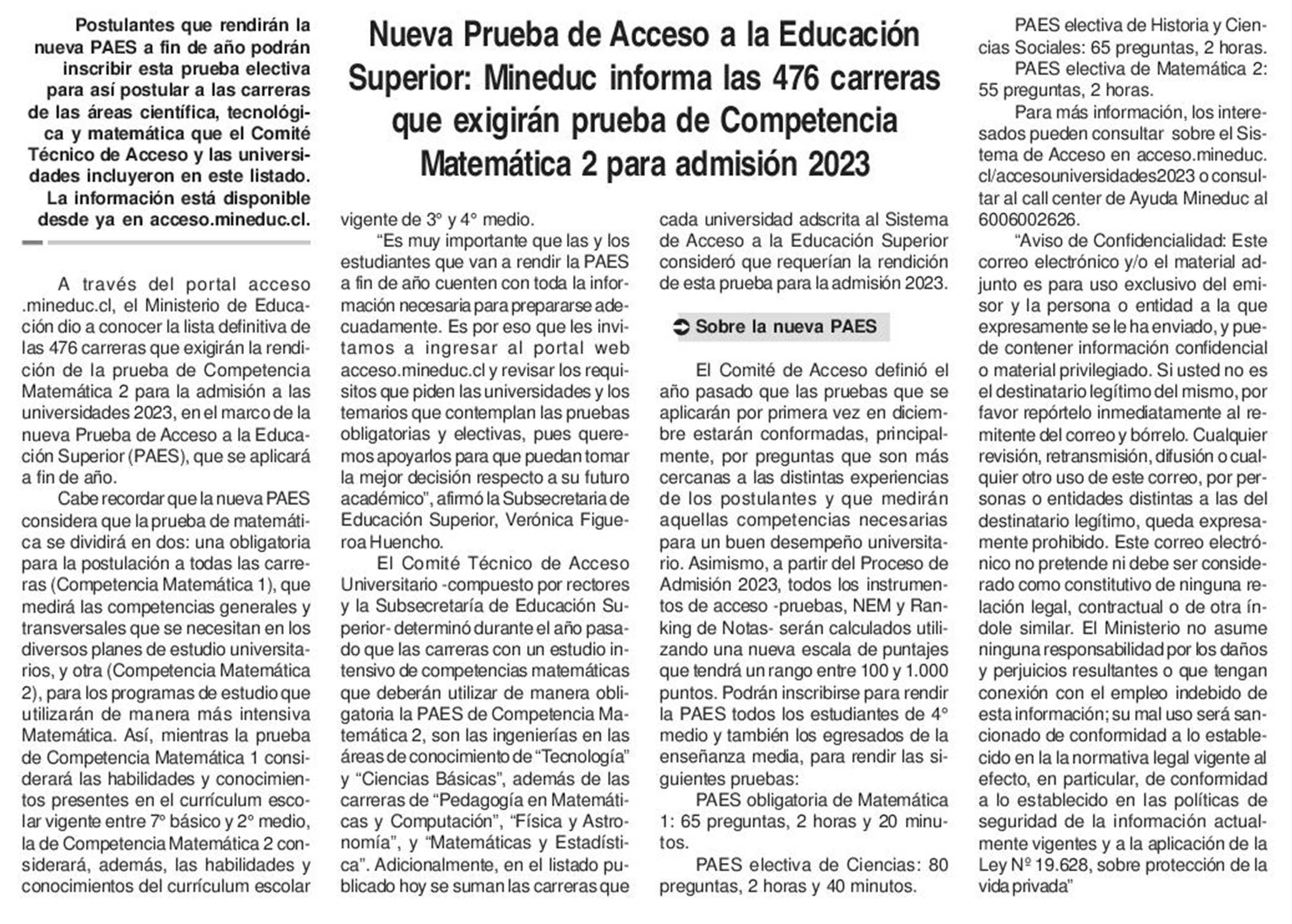 | Título: | Nueva Prueba de Acceso a la Educación Superior: Mineduc informa las 476 carreras que exigirán prueba de Competencia Matemática 2 para admisión 2023 |