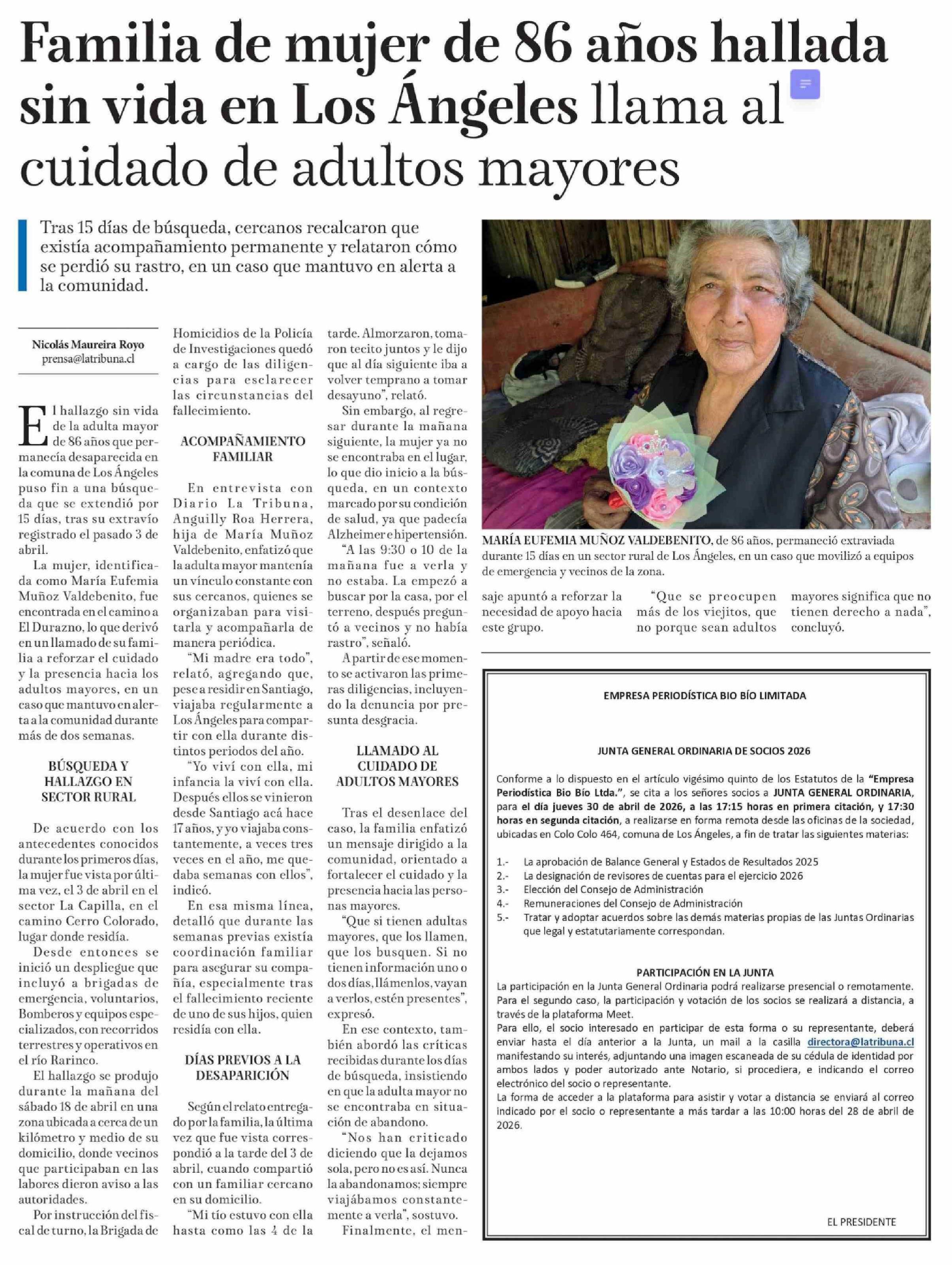 Familia de mujer de 86 años hallada sin vida en Los Angeles llama al cuidado de adultos mayores 21-04-2026 La Tribuna |