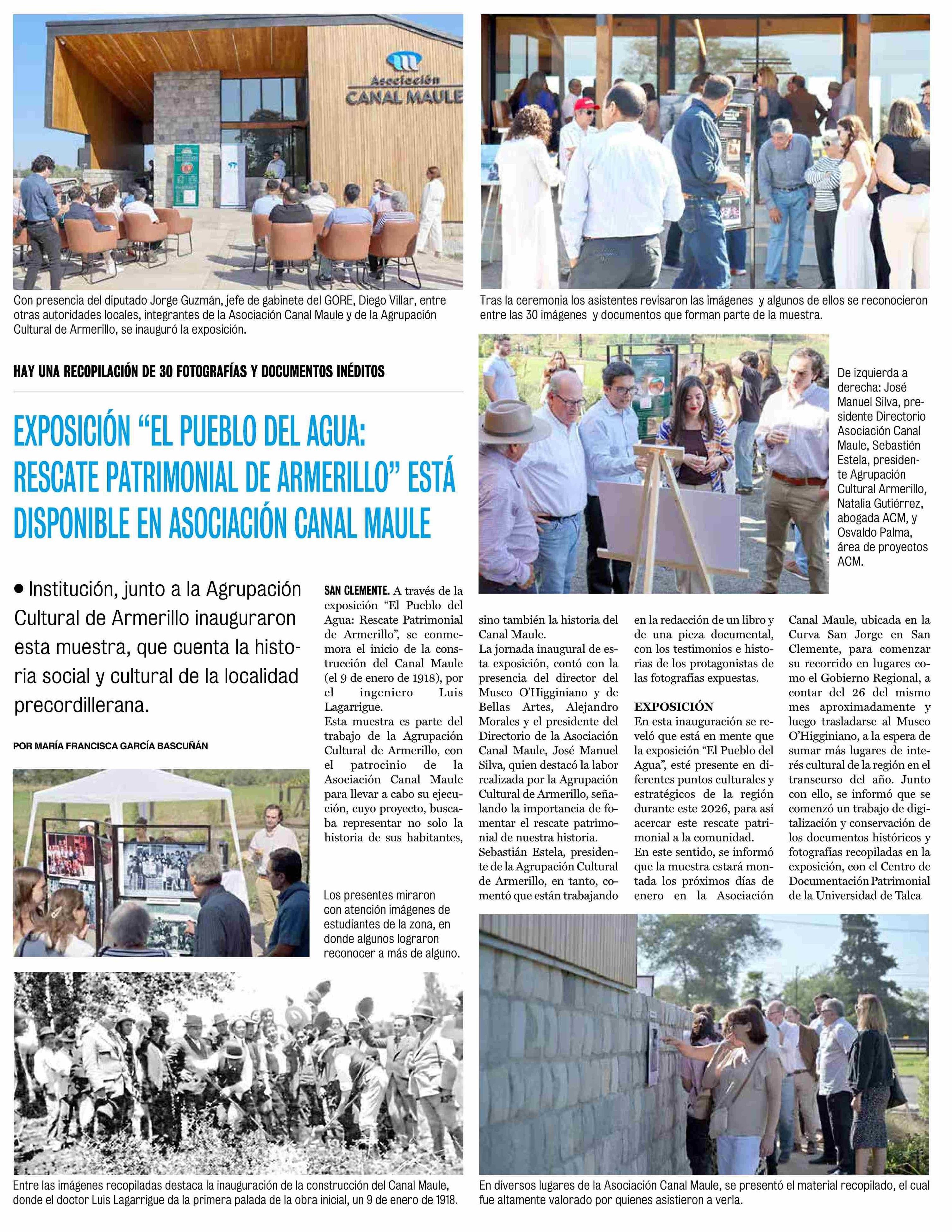 EXPOSICIÓN "EL PUEBLO DEL AGUA: RESCATE PATRIMONIAL DE ARMERILLO" ESTÁ DISPONIBLE EN ASOCIACIÓN CANAL MAULE 16-01-2026 La Prensa de Curicó |