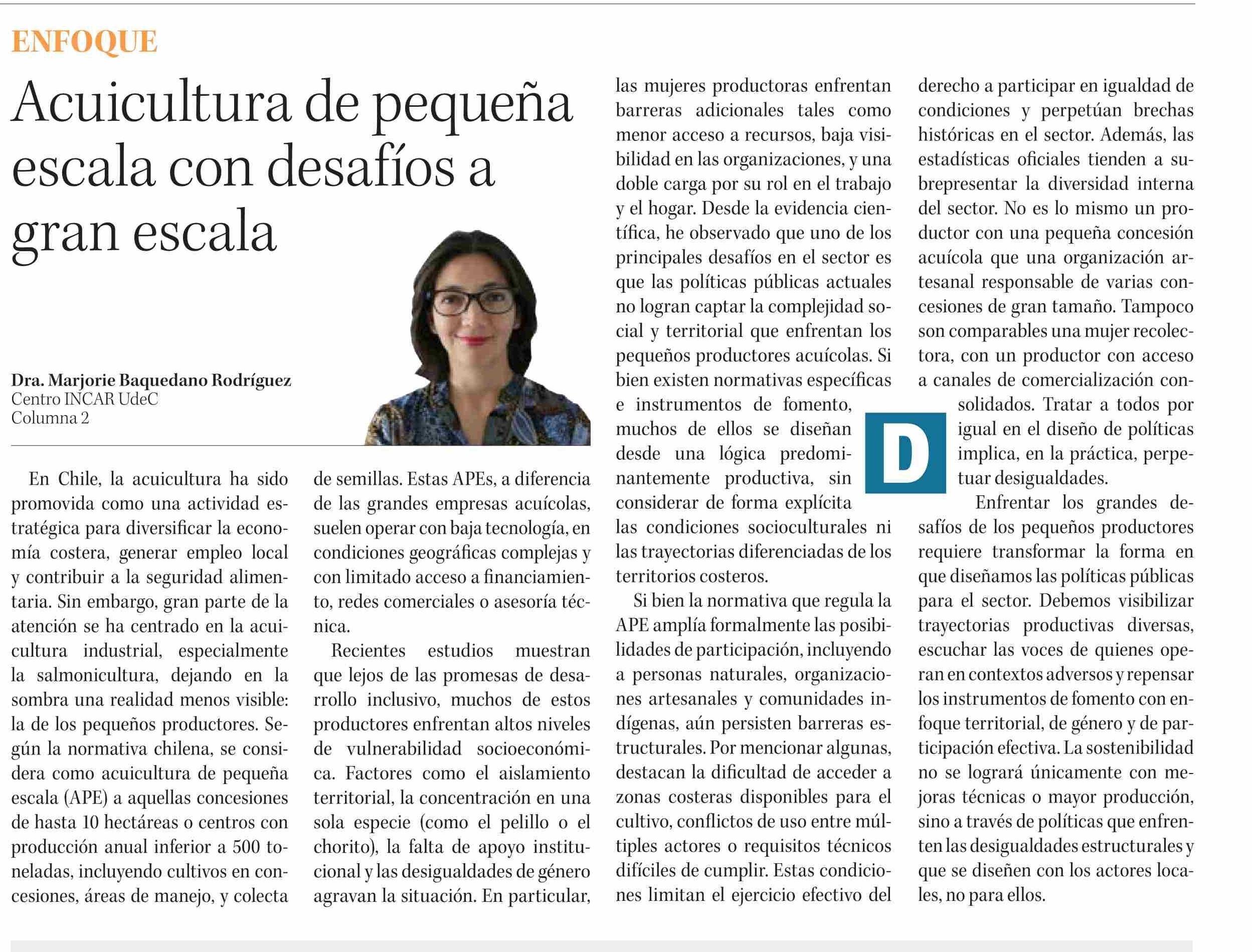 COLUMNAS DE OPINIÓN: Acuicultura de pequeña escala con desafíos a gran escala 11-06-2025 Diario Concepción |