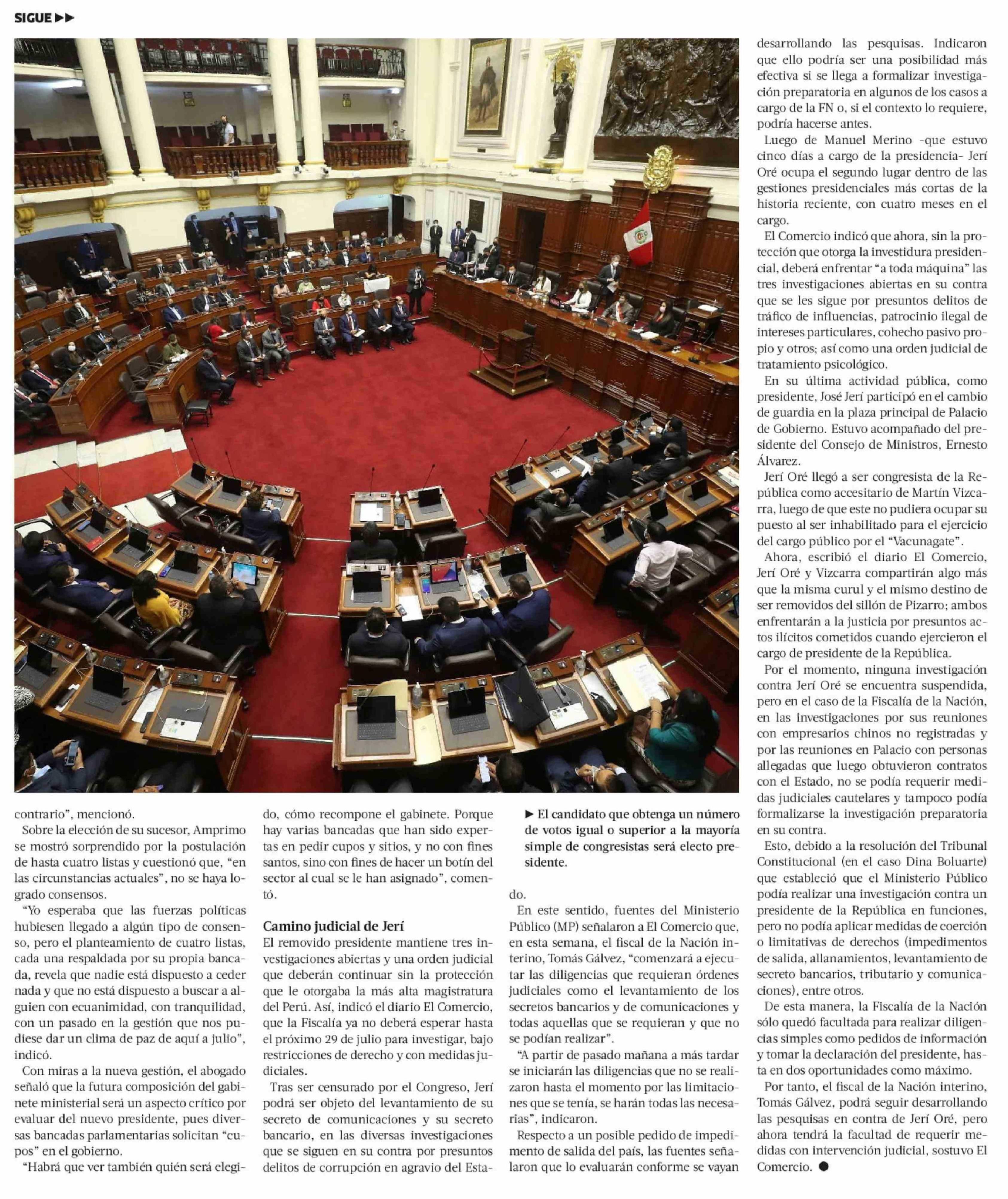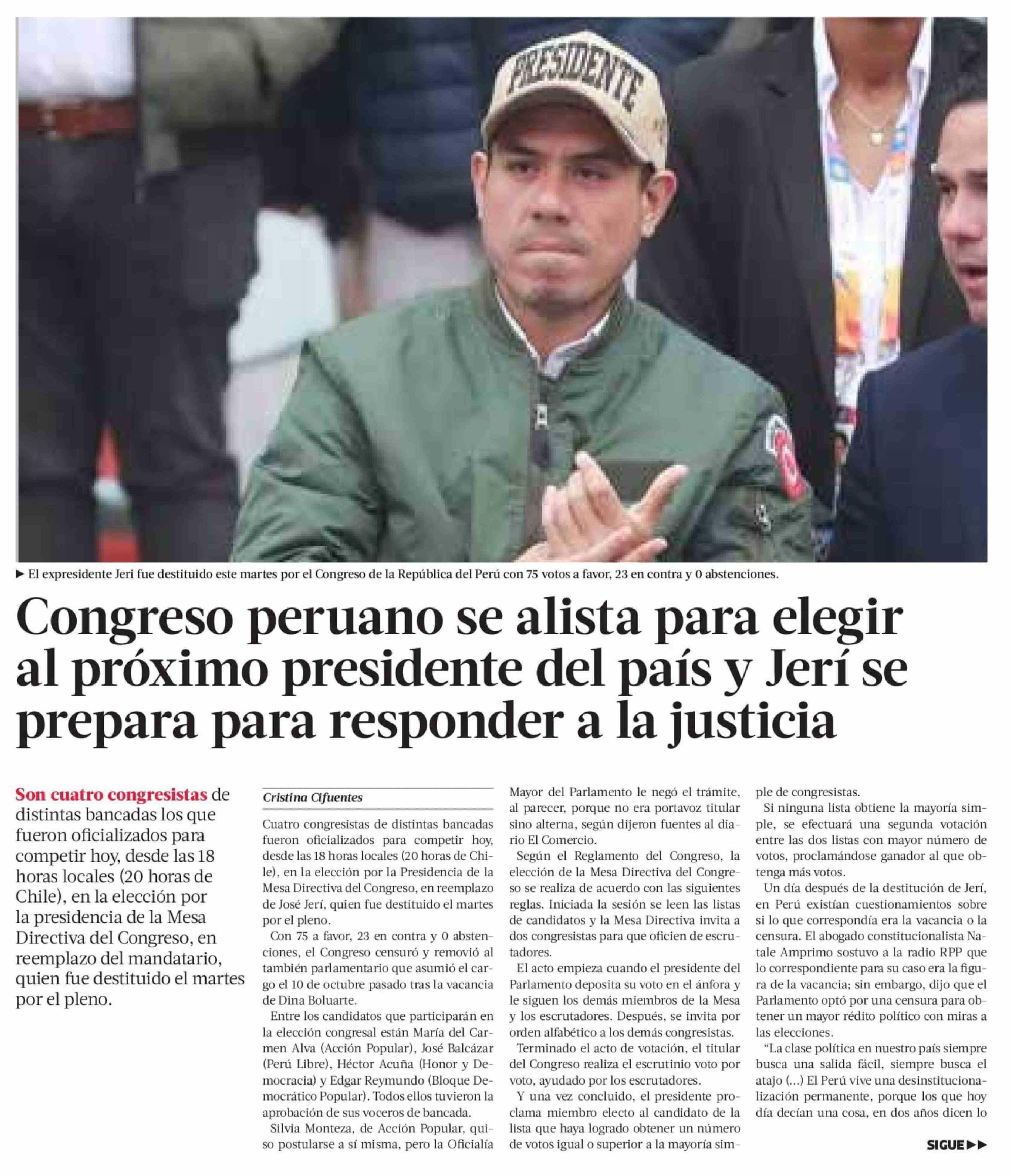 Congreso peruano se alista para elegir al próximo presidente del país y Jerí se prepara para responder a la justicia 19-02-2026 La Tercera |