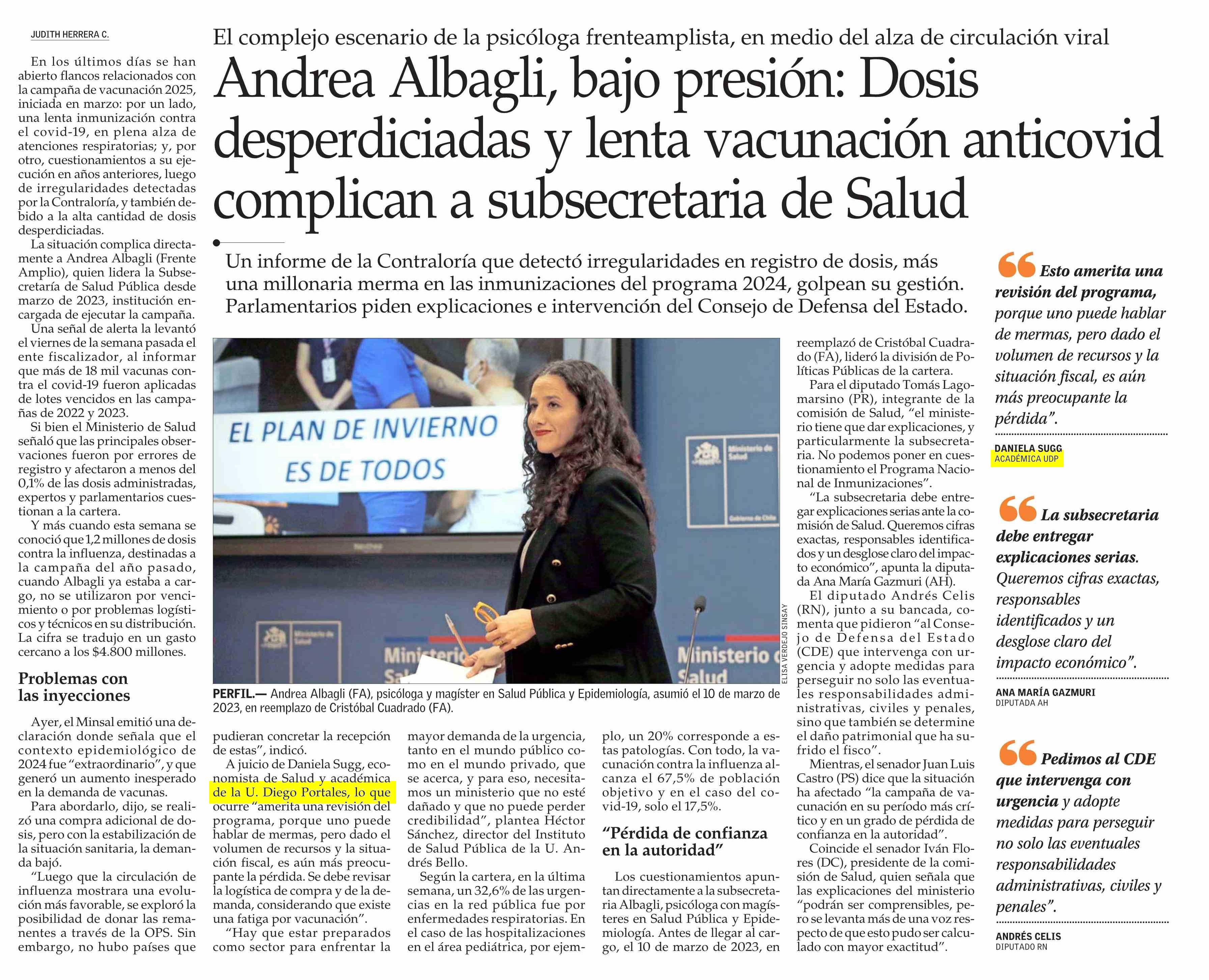 Andrea Albagli, bajo presión: Dosis desperdiciadas y lenta vacunación anticovid complican a subsecretaria de Salud 17-05-2025 El Mercurio |
