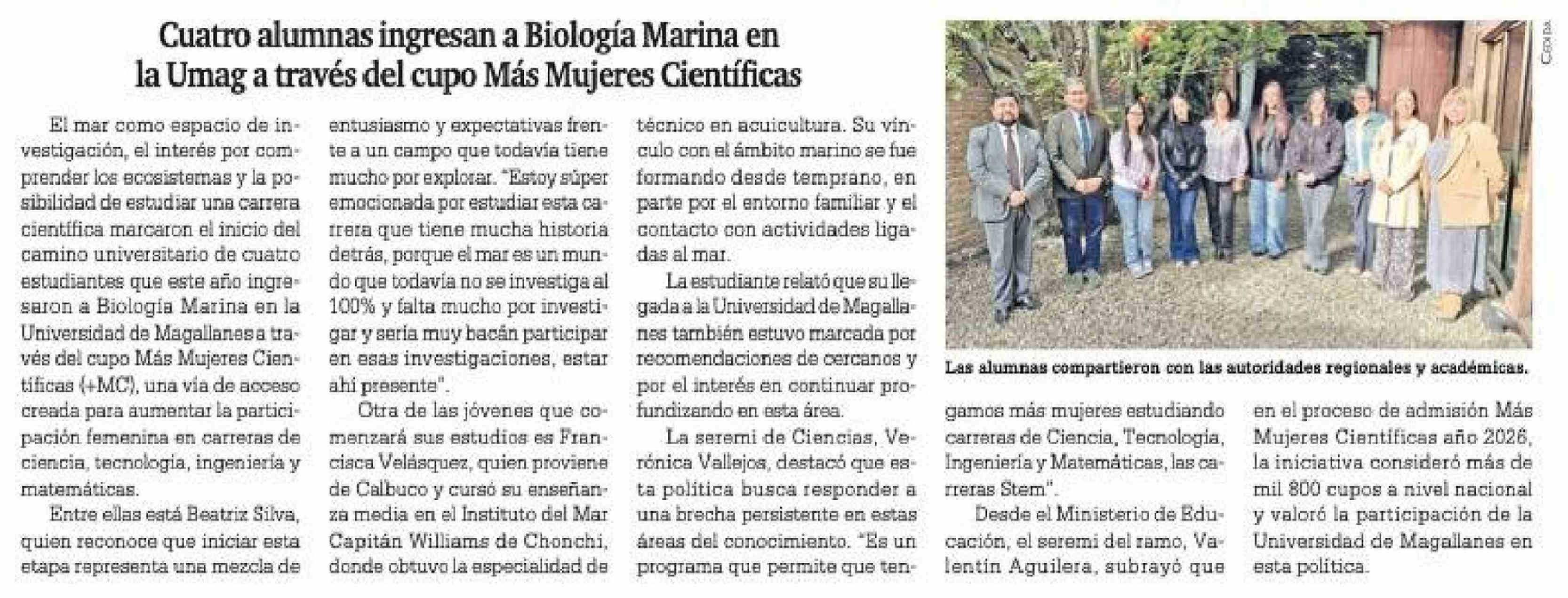 Título: Cuatro alumnas ingresan a Biología Marina en la Umag a través del cupo Más Mujeres Científicas
