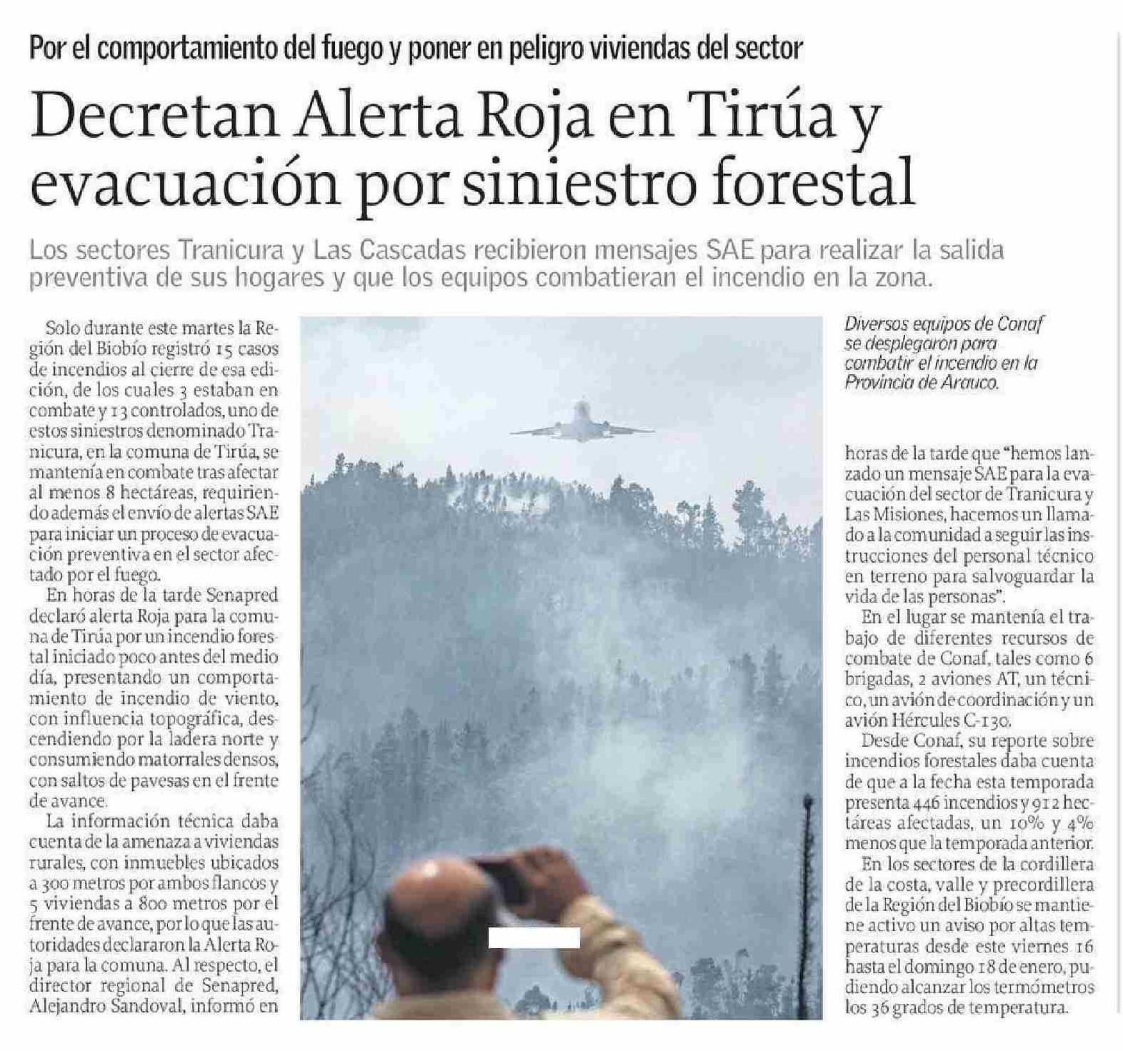 Título: Decretan Alerta Roja en Tirúa y evacuación por siniestro forestal