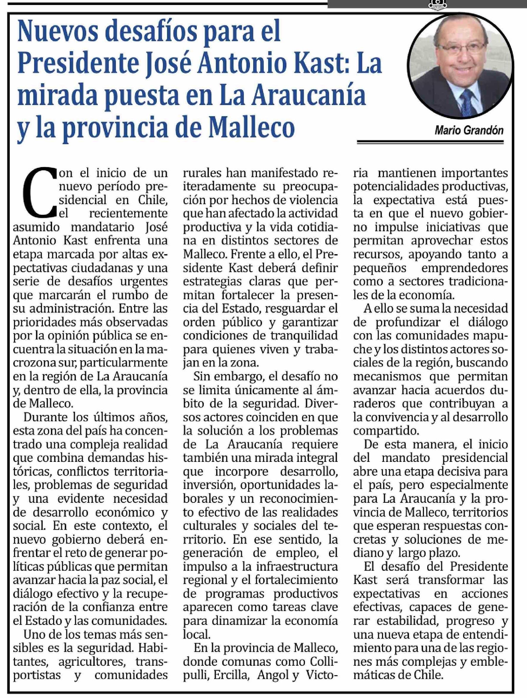 | Título: | Columnas de Opinión: Nuevos desafíos para el Presidente José Antonio Kast: La mirada puesta en La Araucanía y la provincia de Malleco |
