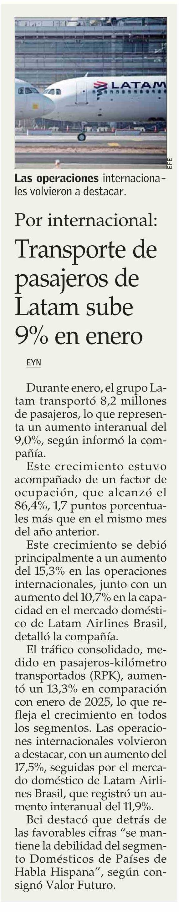 | Título: | Transporte de pasajeros de Latam sube 9% en enero |