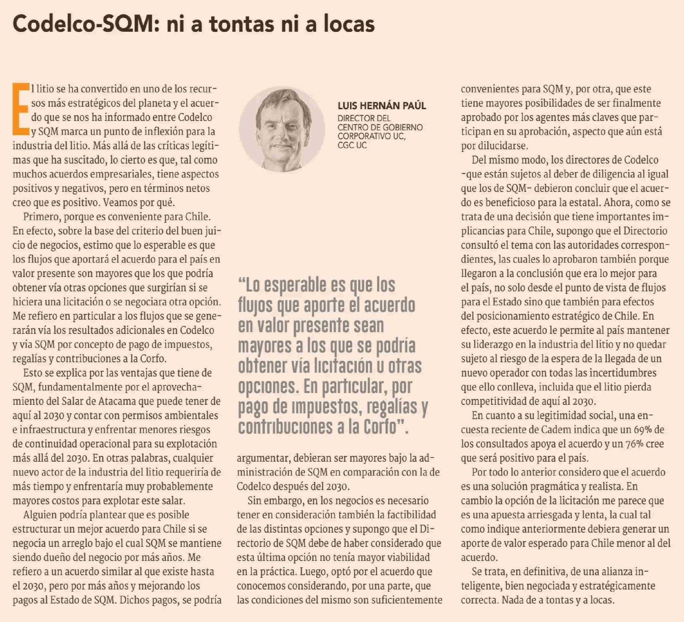 Columnas de Opinión: Codelco-SQM: ni a tontas ni a locas 17-06-2025 Diario Financiero |