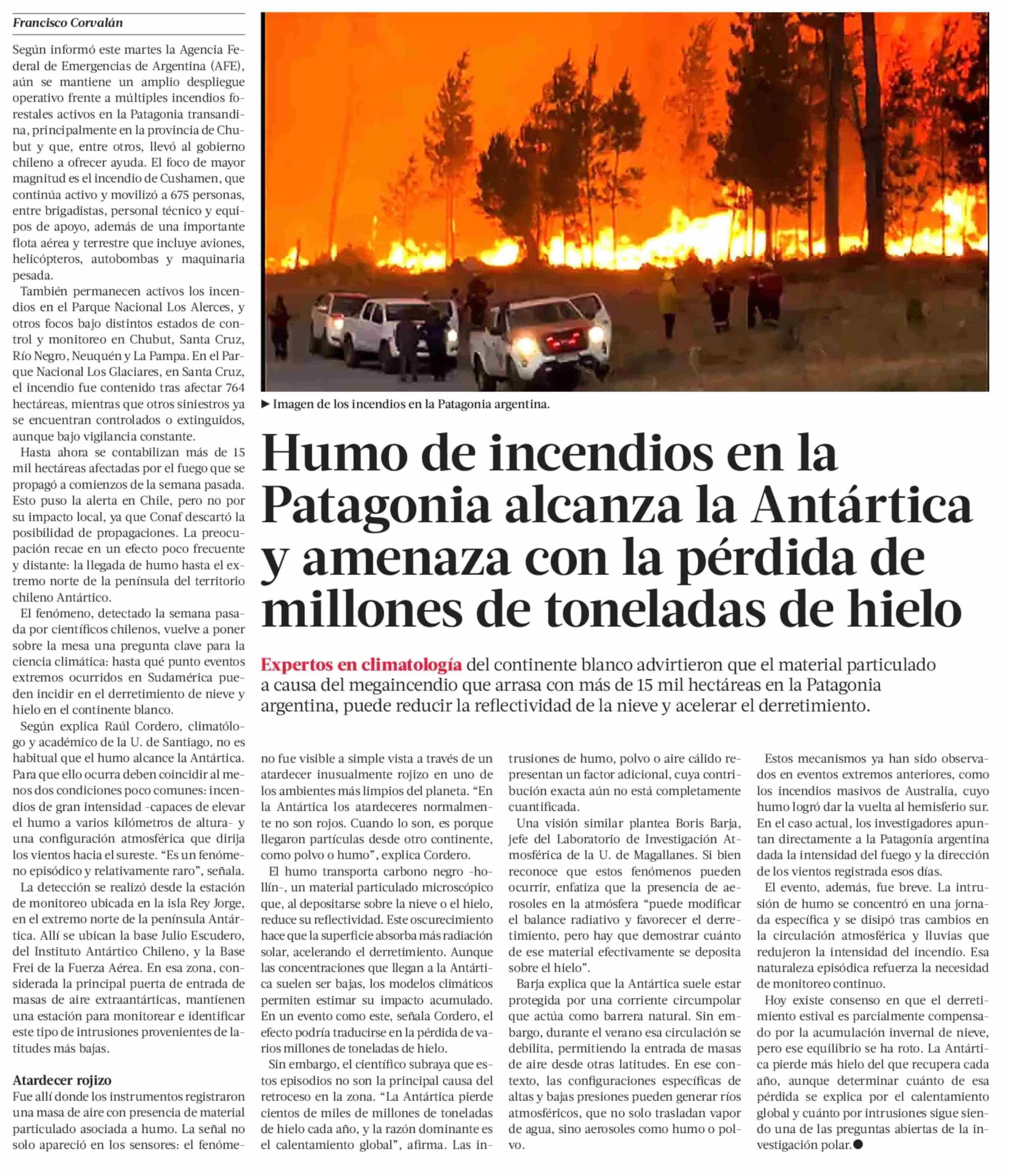 Título: Humo de incendios en la Patagonia alcanza la Antártica y amenaza con la pérdida de millones de toneladas de hielo