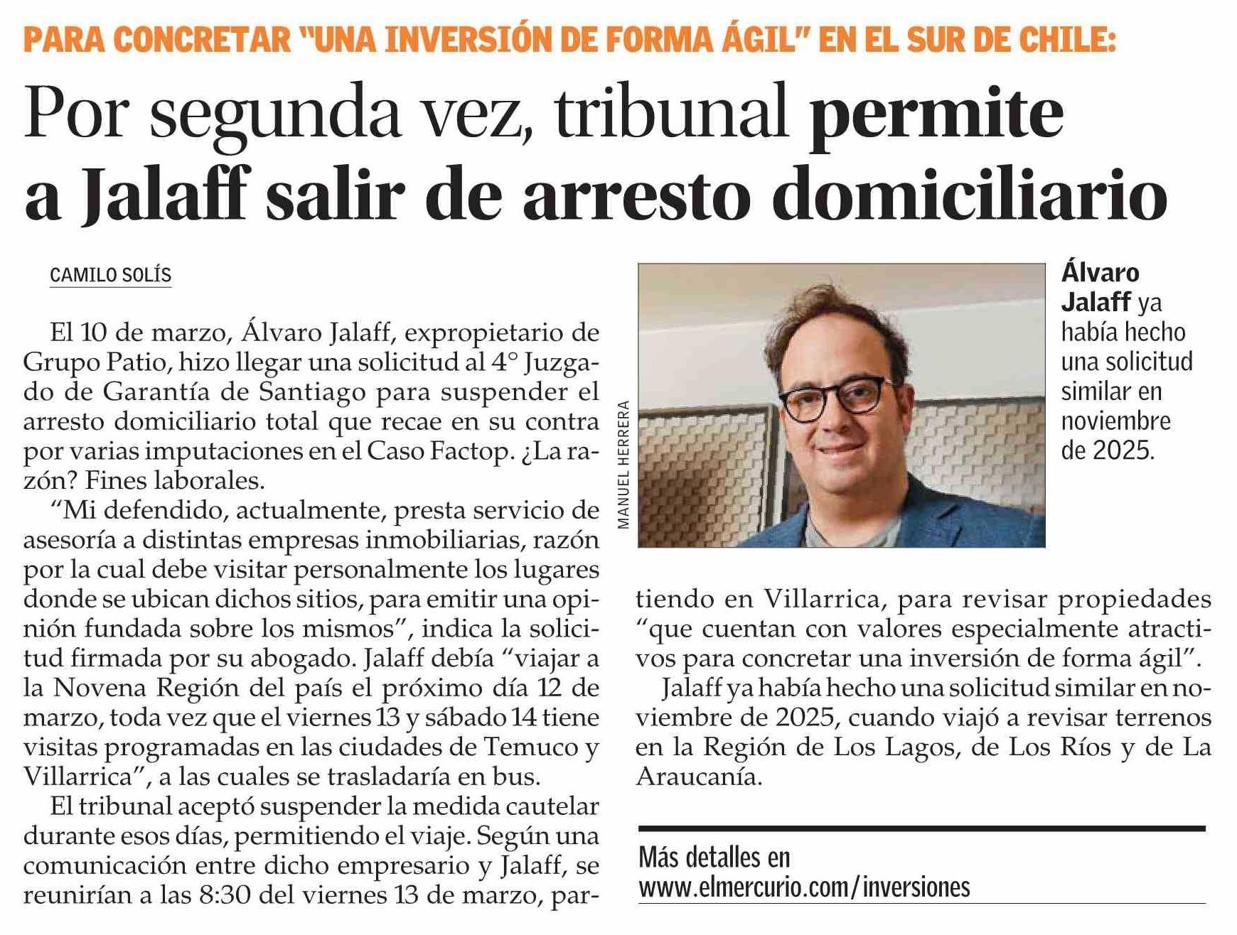 Por segunda vez, tribunal permite a Jalaff salir de arresto domiciliario 18-03-2026 El Mercurio |