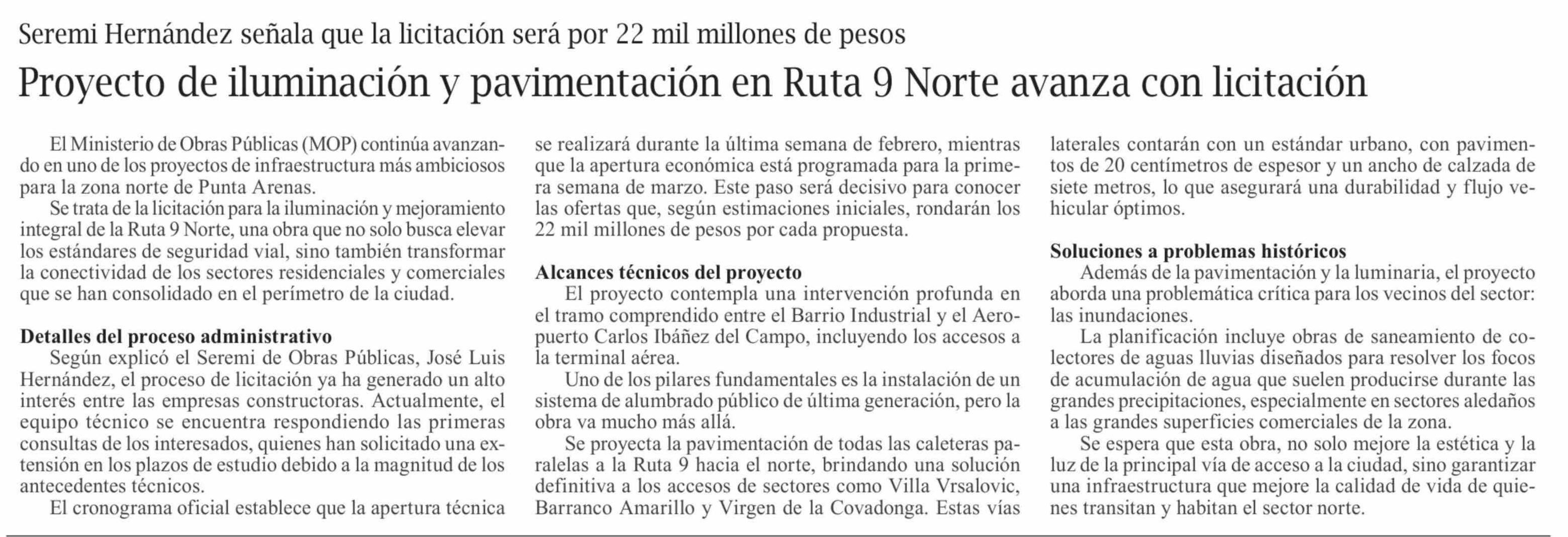 Proyecto de iluminación y pavimentación en Ruta 9 Norte avanza con licitación 18-02-2026 El Pingüino |