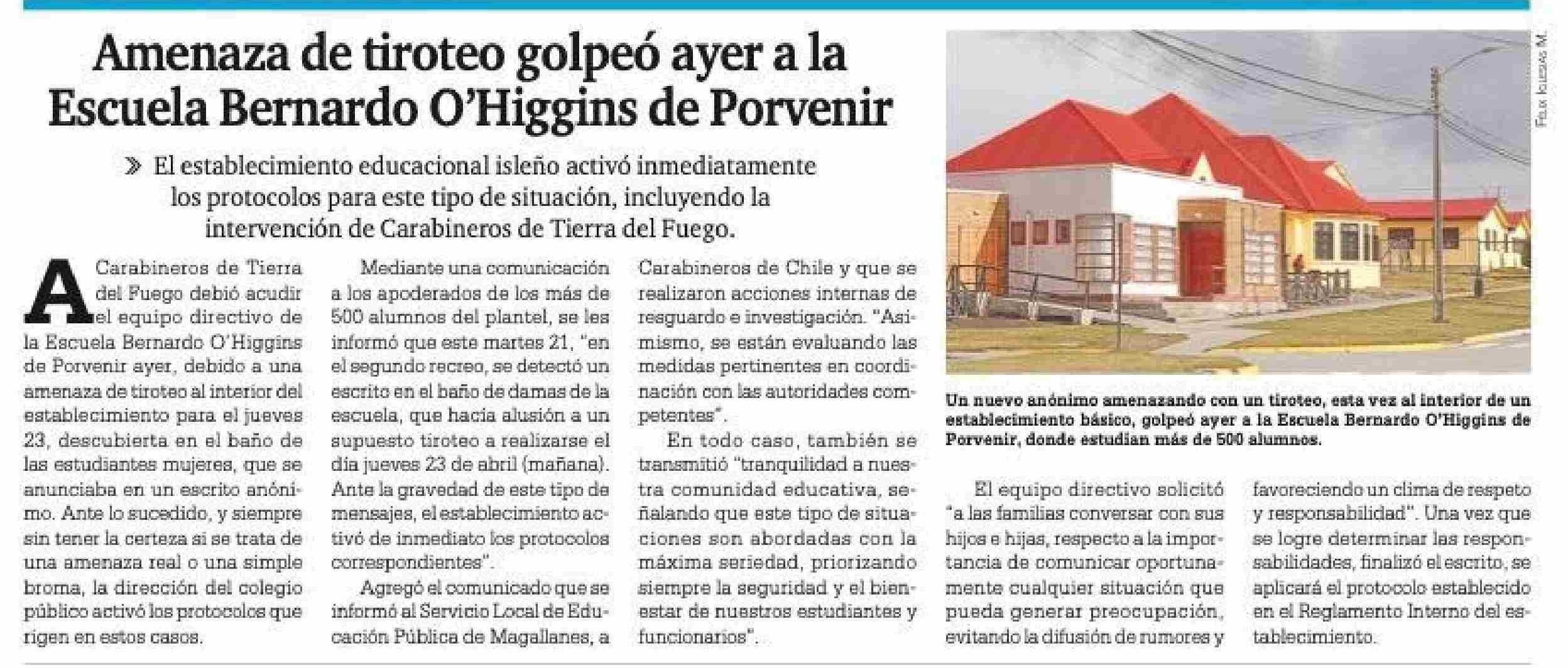 Amenaza de tiroteo golpeó ayer a la Escuela Bernardo O'Higgins de Porvenir 22-04-2026 La Prensa Austral |
