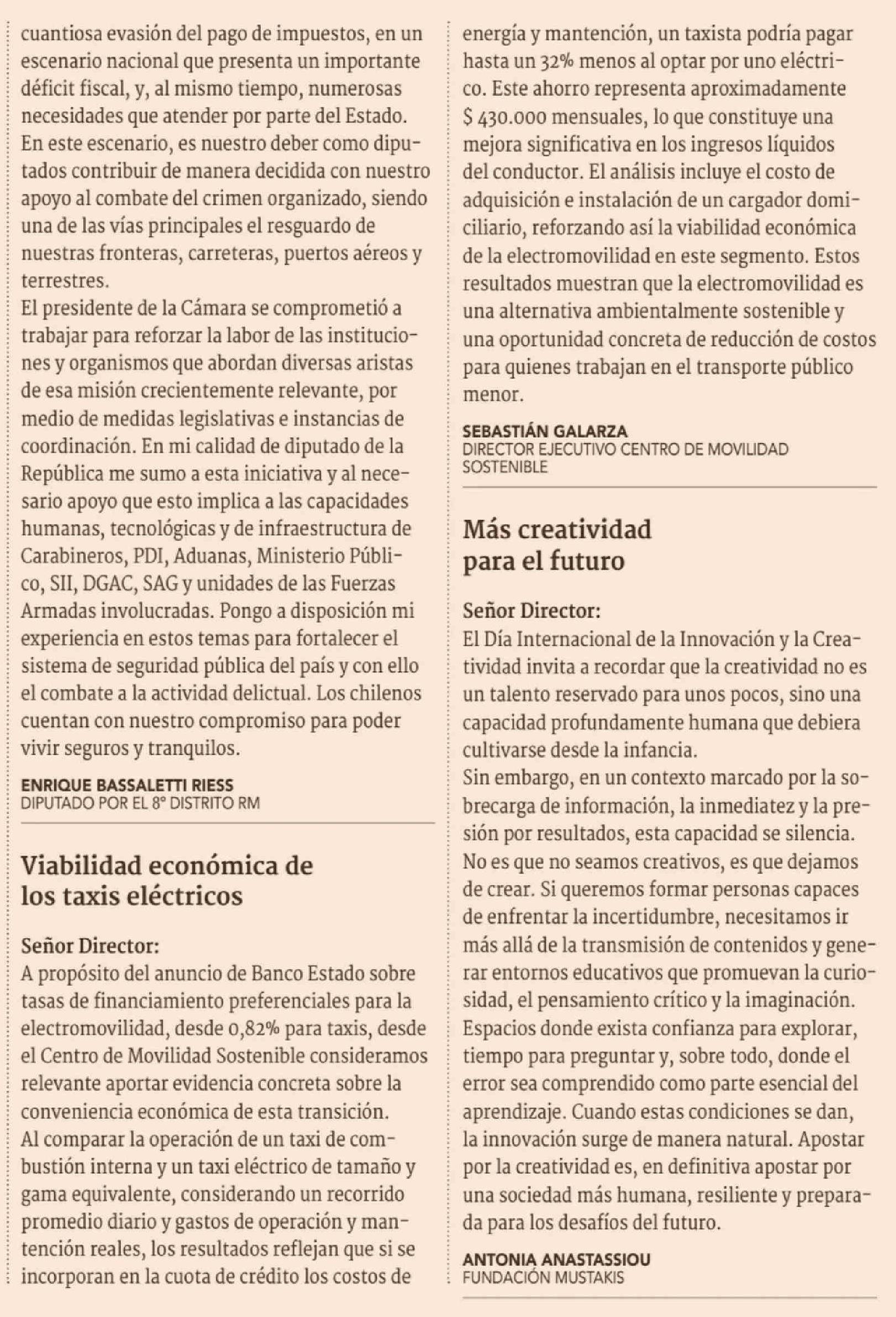 Cartas: Viabilidad económica de los taxis eléctricos 23-04-2026 Diario Financiero |