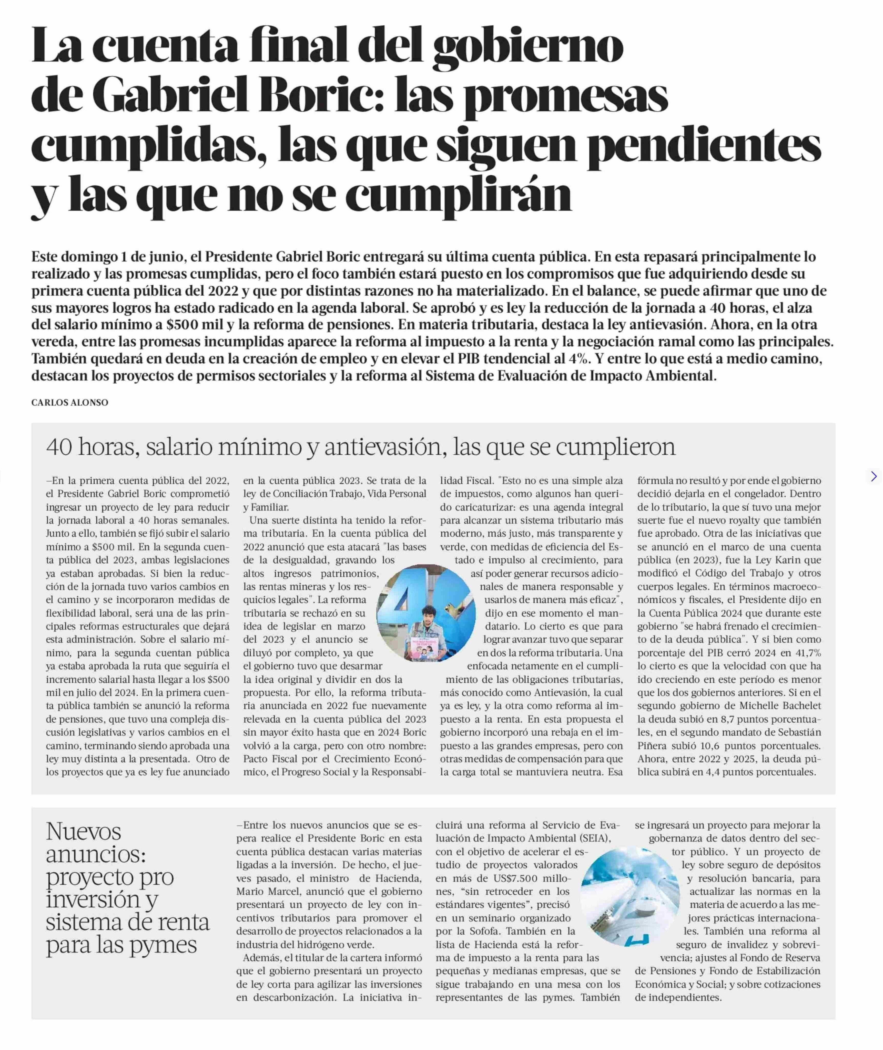 La cuenta final del gobierno de Gabriel Boric: las promesas cumplidas, las que siguen pendientes y las que no se cumplirán 31-05-2025 La Tercera |