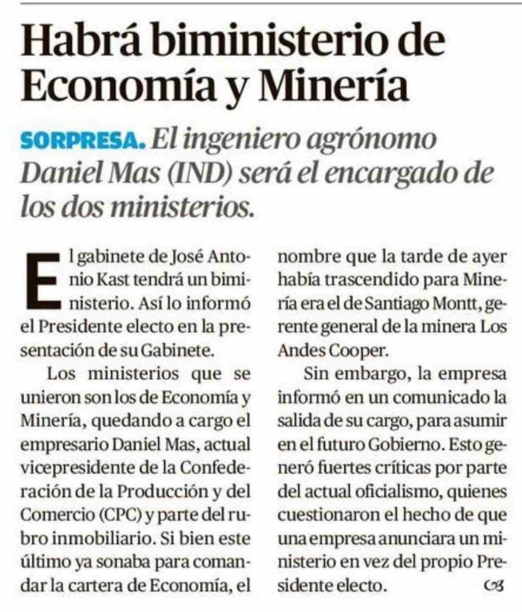 Habrá biministerio de Economía y Minería 21-01-2026 El Austral de la Araucanía |