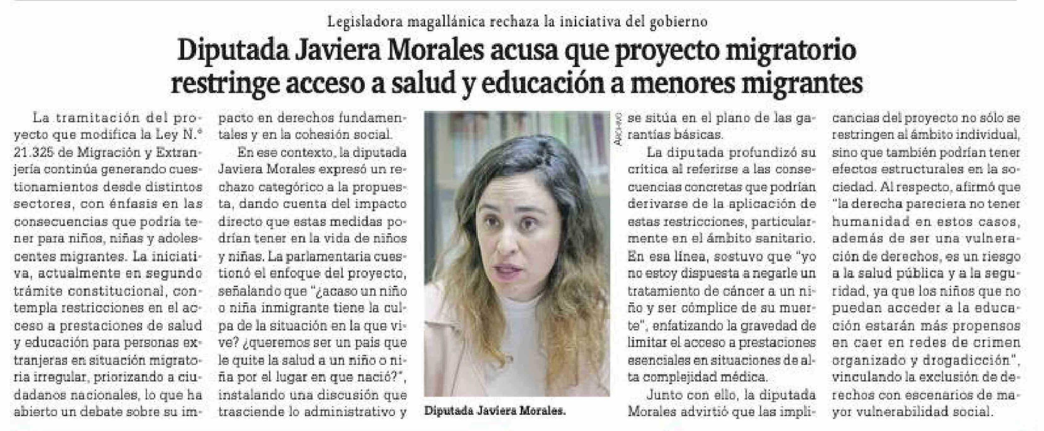 Diputada Javiera Morales acusa que proyecto migratorio restringe acceso a salud y educación a menores migrantes 30-03-2026 La Prensa Austral |