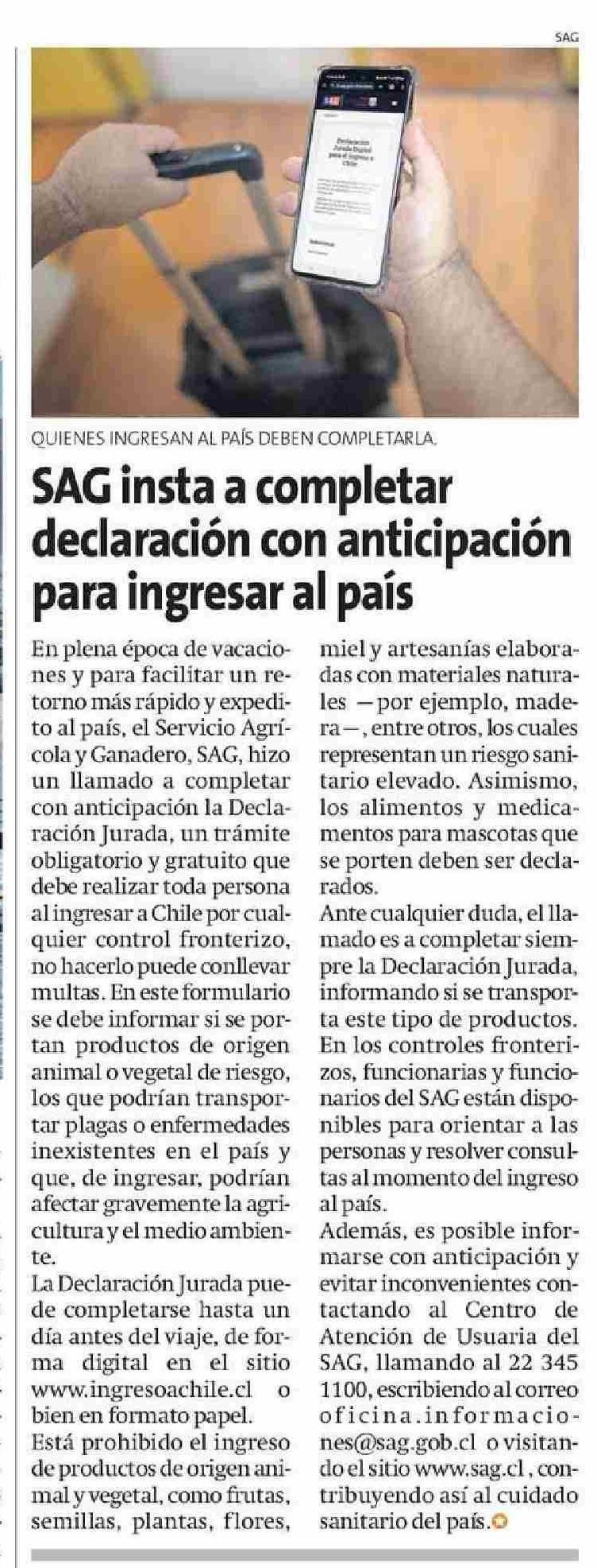 SAG insta a completar declaración con anticipación para ingresar al país 14-01-2026 La Estrella de Arica |