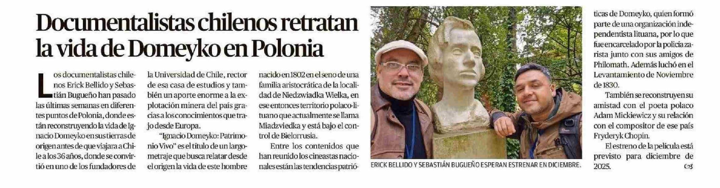 Documentalistas chilenos retratan la vida de Domeyko en Polonia 25-05-2025 El Mercurio de Valparaíso |