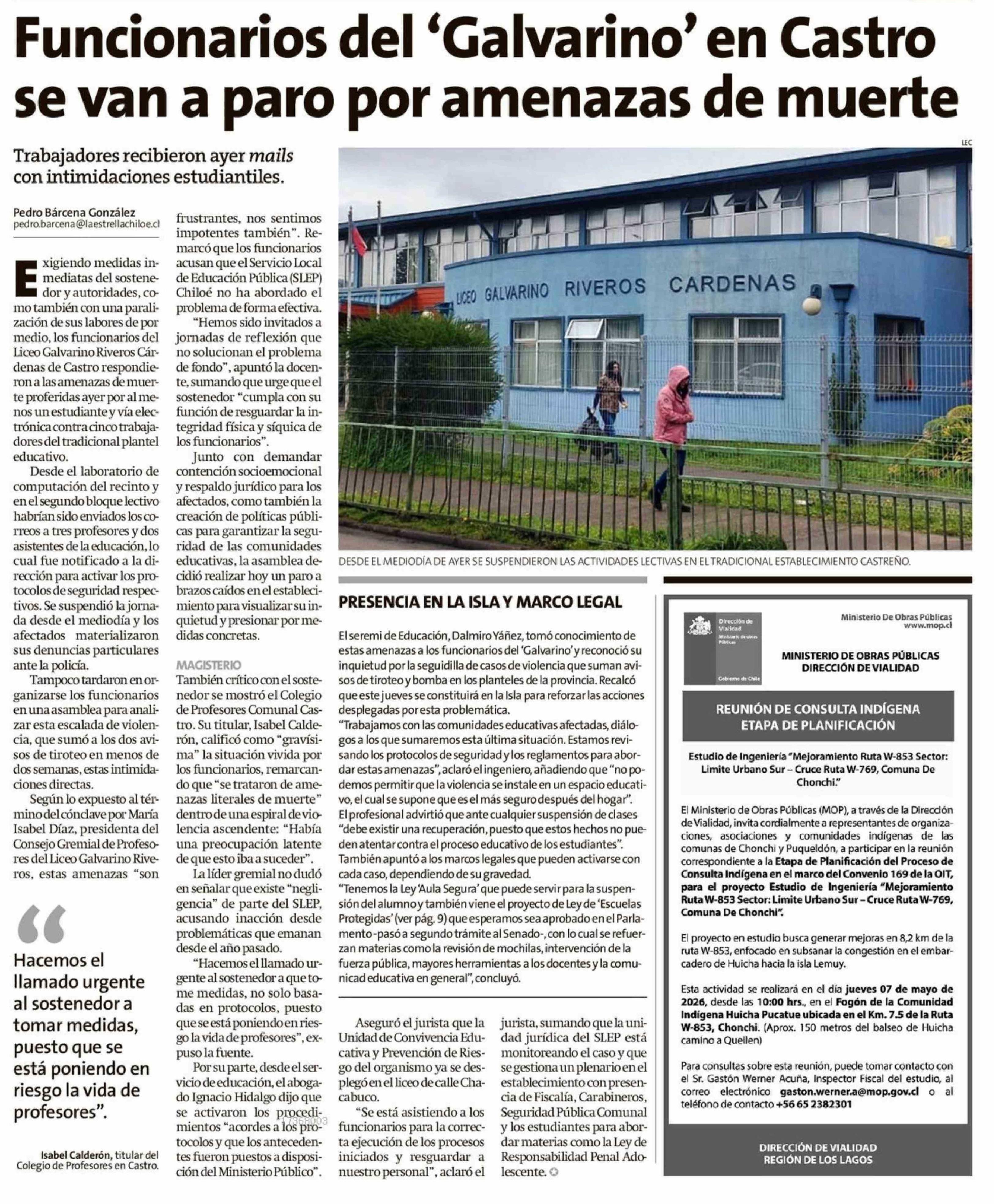 Funcionarios del 'Galvarino' en Castro se van a paro por amenazas de muerte 22-04-2026 La Estrella de Chiloé |