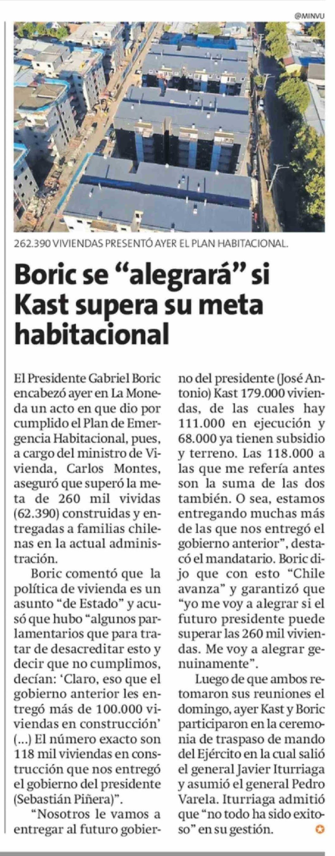 | Título: | Boric se "alegrará" si Kast supera su meta habitacional |