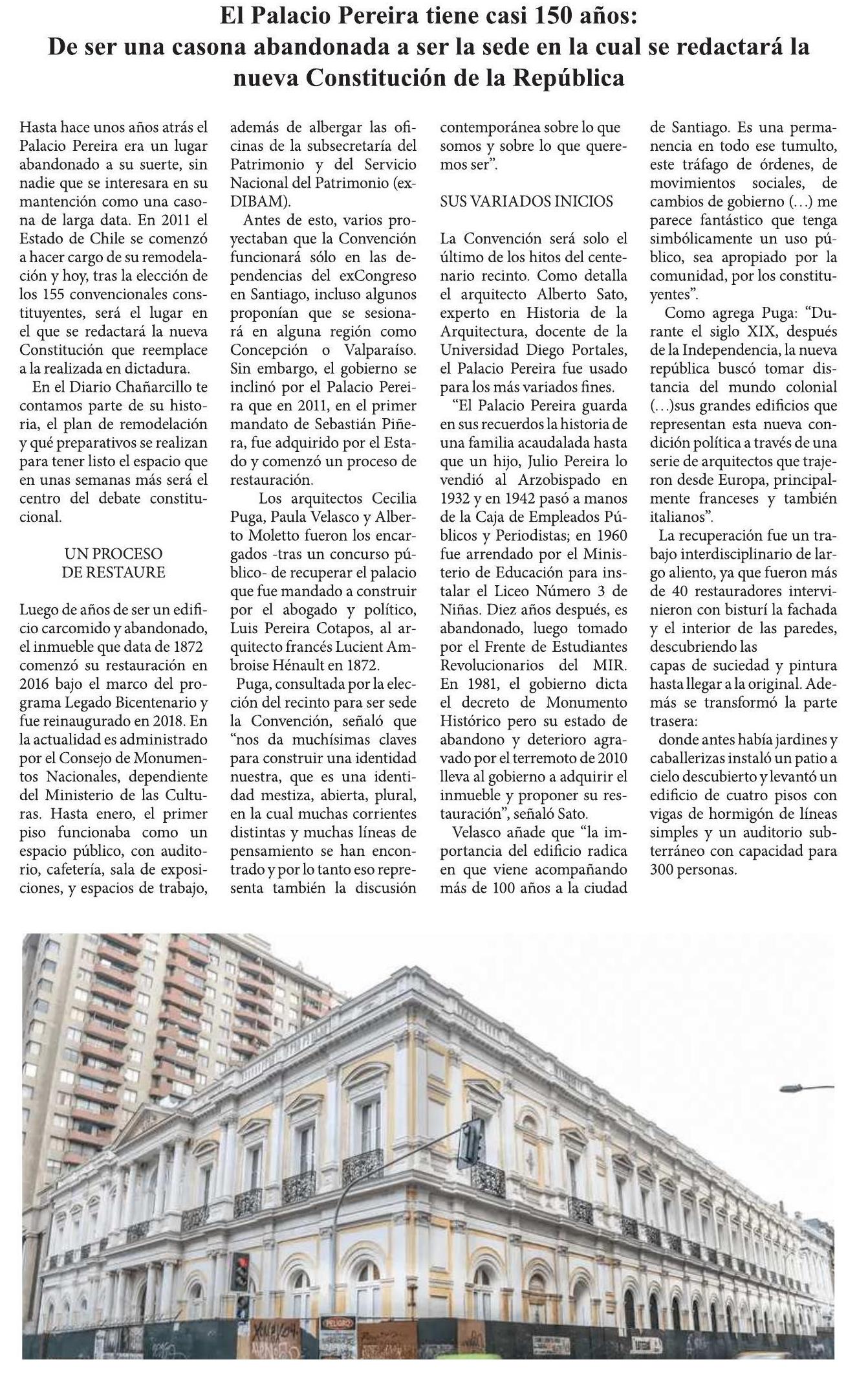 El Palacio Pereira tiene casi 150 años: De ser una casona abandonada a ser la sede en la cual se redactará la nueva Constitución de la República 21-05-2021 Diario Chañarcillo |