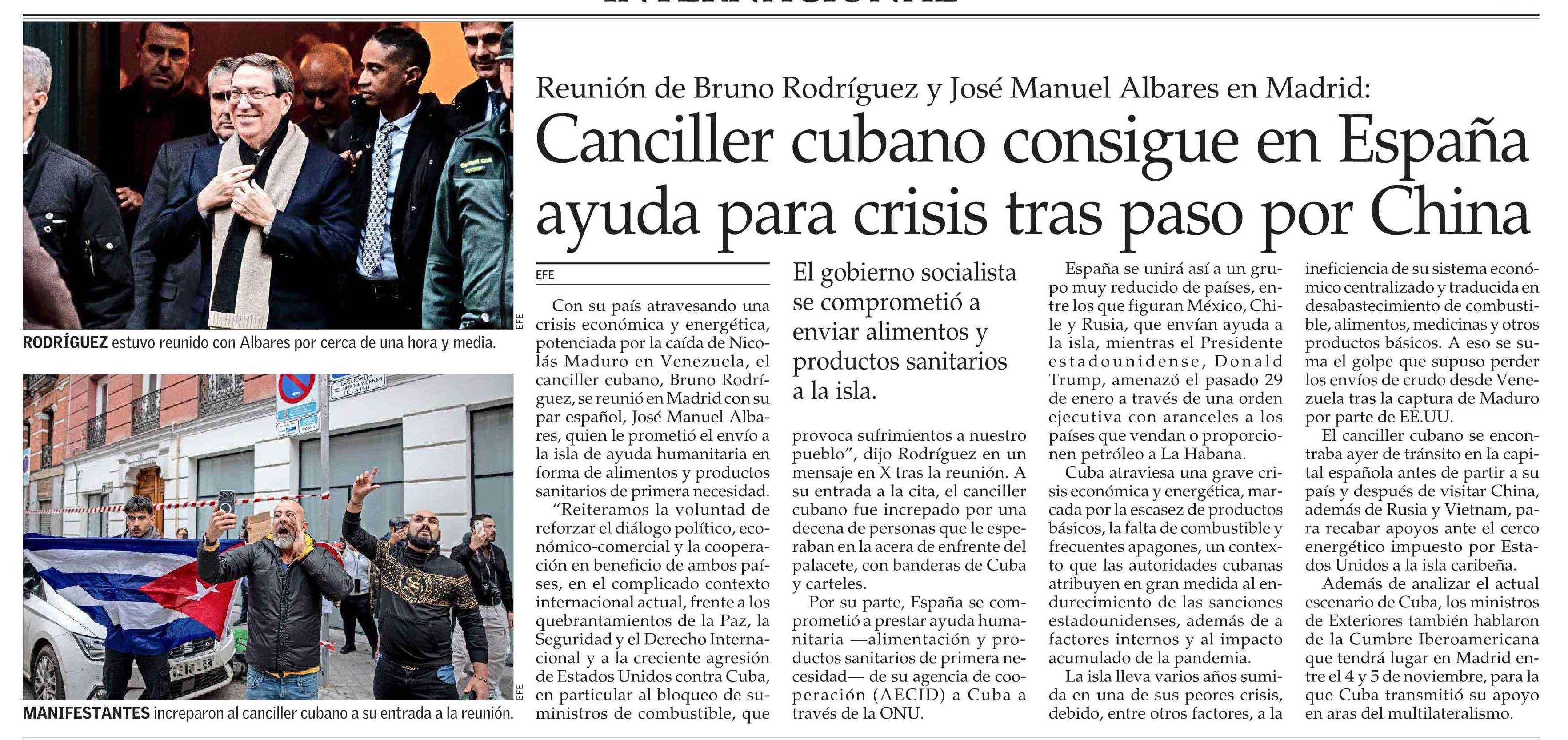 Canciller cubano consigue en España ayuda para crisis tras paso por China 17-02-2026 El Mercurio |