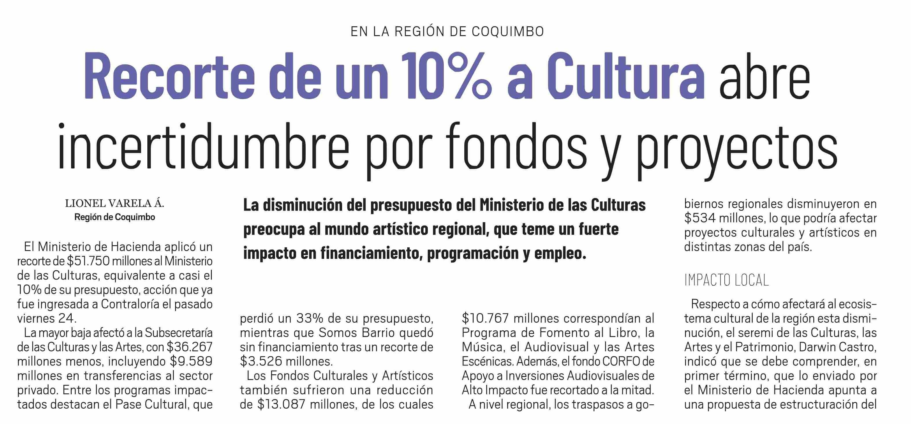 Título: Recorte de un 10% a Cultura abre incertidumbre por fondos y proyectos