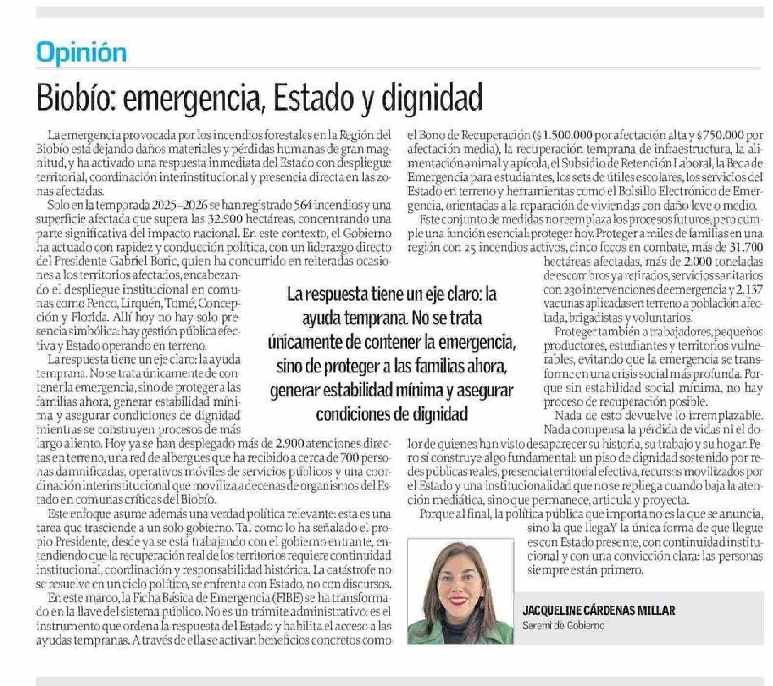 | Título: | COLUMNAS DE OPINIÓN: Bio Bio, emergencia, Estado y dignidad |