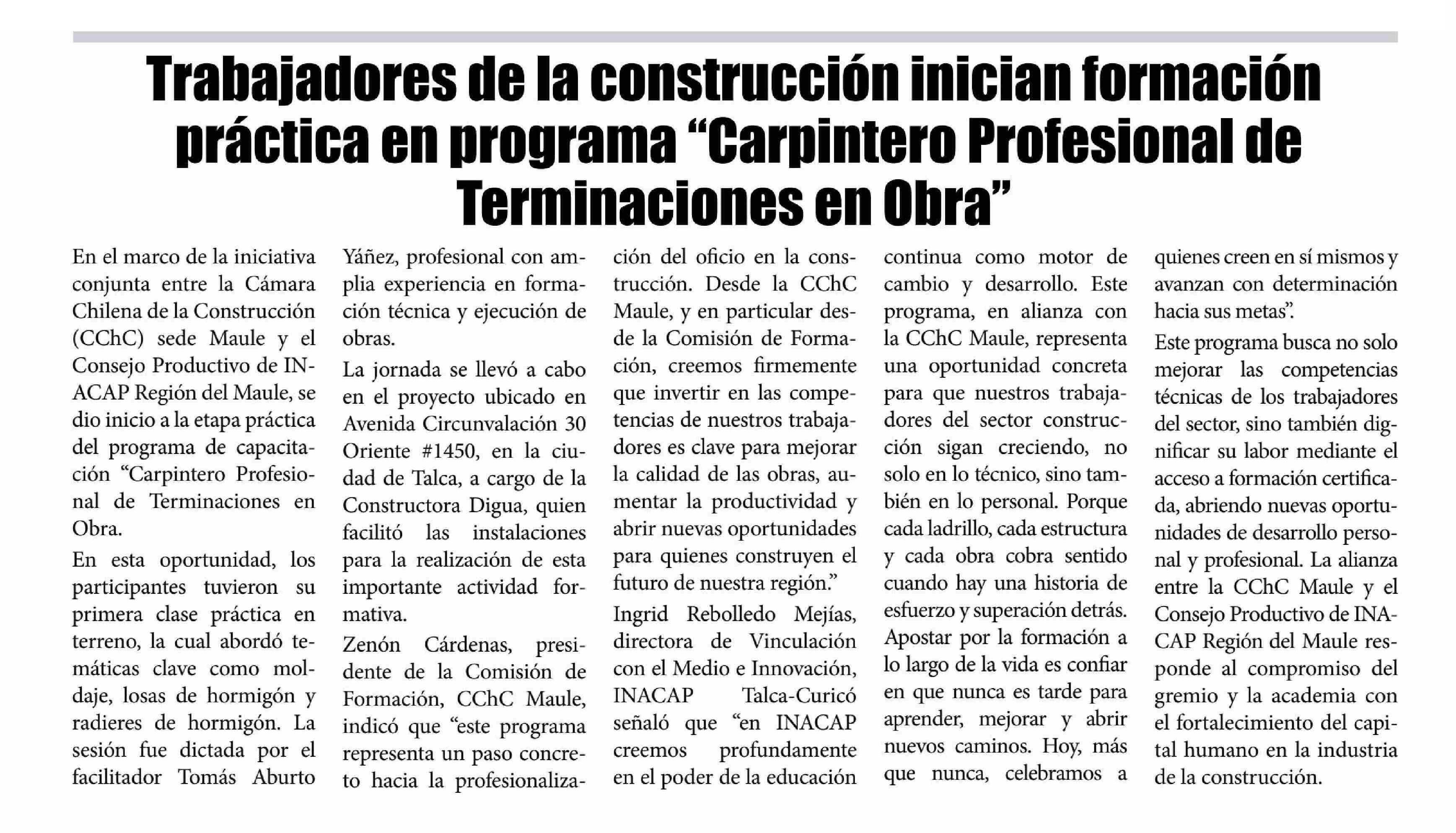 Trabajadores de la construcción inician formación práctica en programa “Carpintero Profesional de Terminaciones en Obra” 25-05-2025 El Lector |