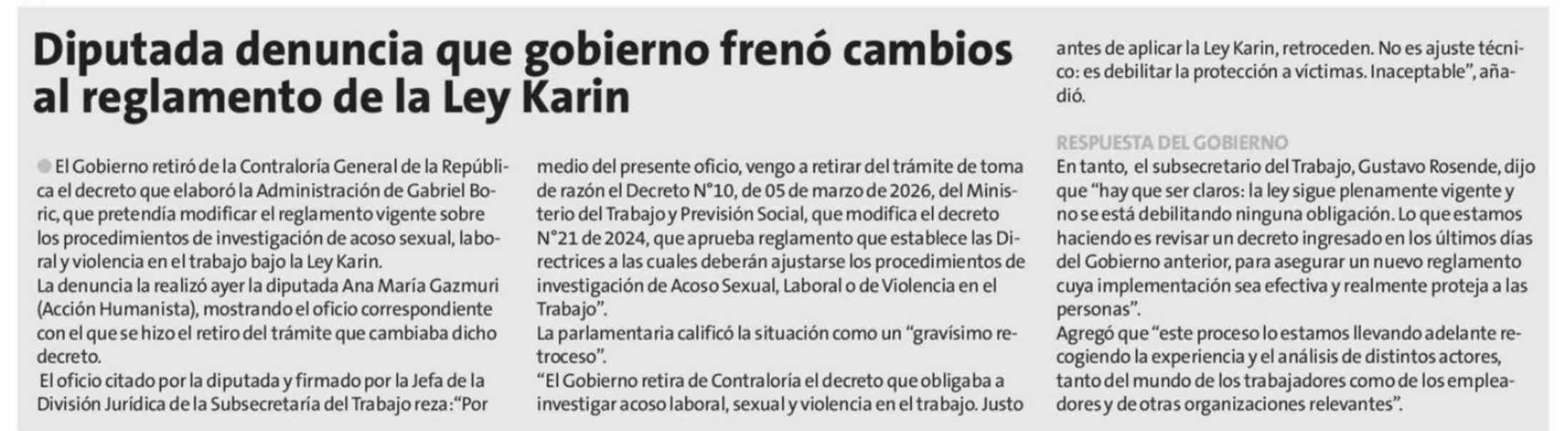 Diputada denuncia que gobierno frenó cambios al reglamento de la Ley Karin 05-04-2026 La Estrella de Iquique |
