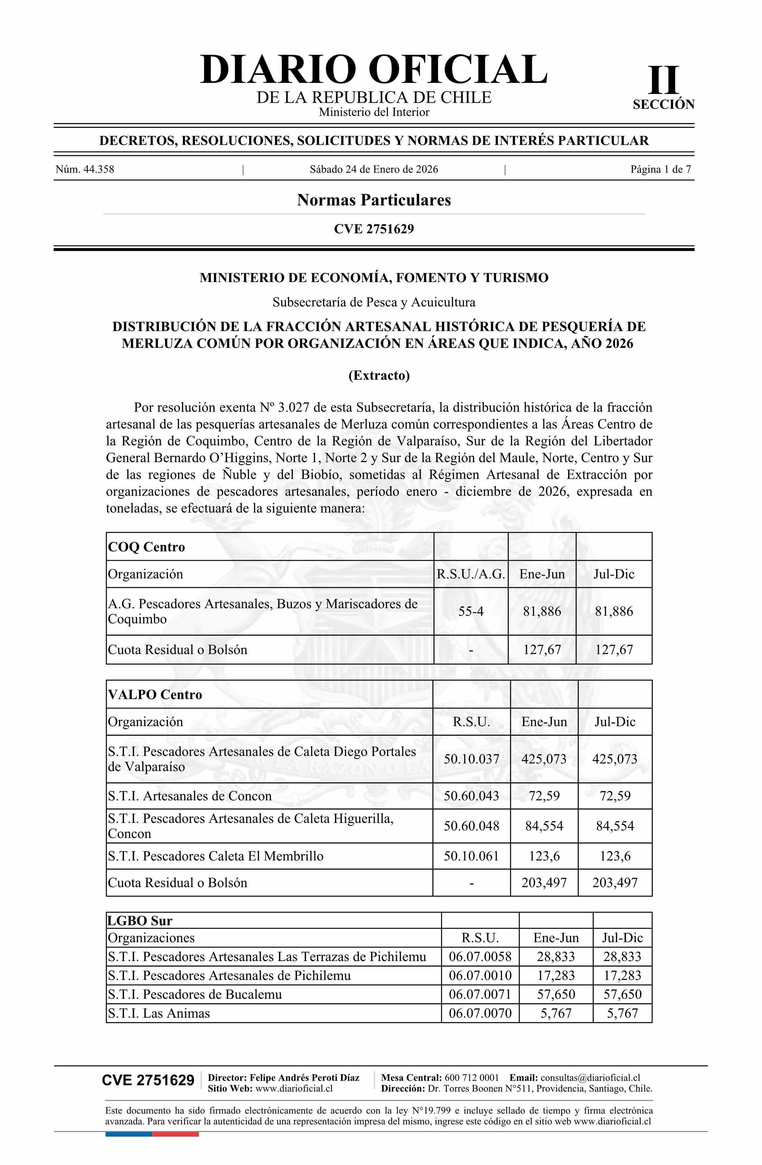Título: Extracto de resolución exenta número 3.027, de 2025.- Establece distribución de la fracción artesanal histórica de pesquería de Merluza común por organización en áreas que indica, año 2026