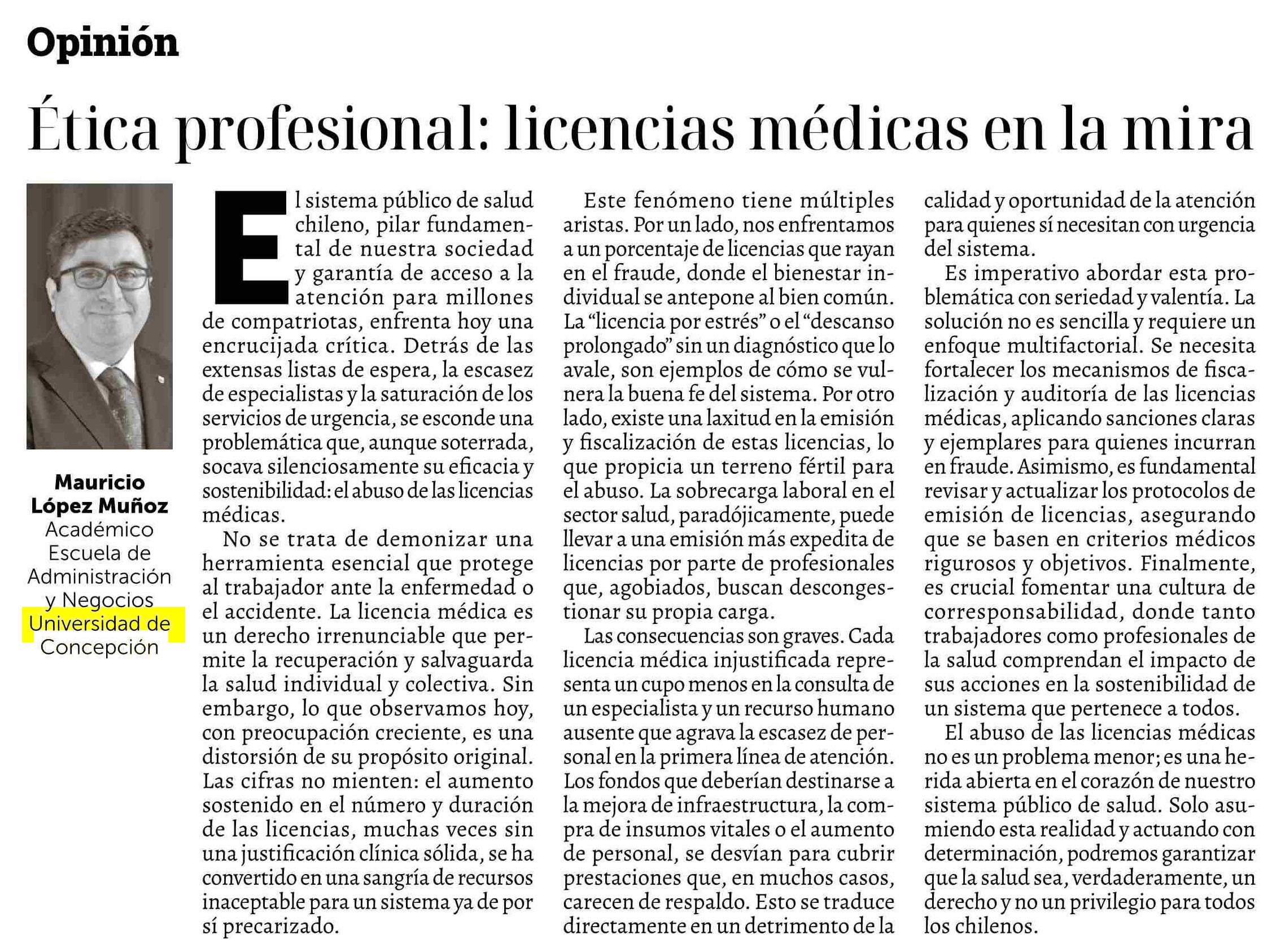 COLUMNAS DE OPINIÓN: Ética profesional: licencias médicas en la mira 16-06-2025 La Discusión |