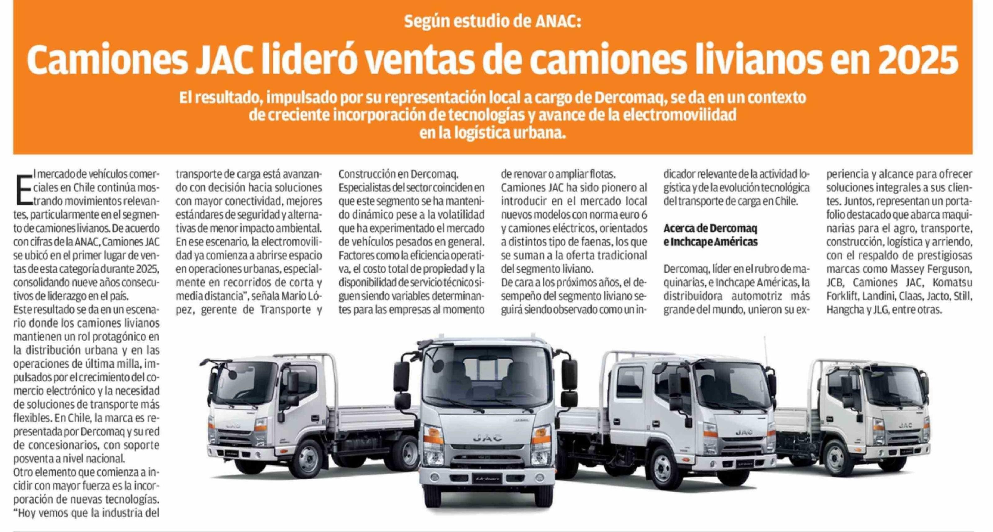 Camiones JAC lideró ventas de camiones livianos en 2025 12-03-2026 El Mercurio de Antofagasta |