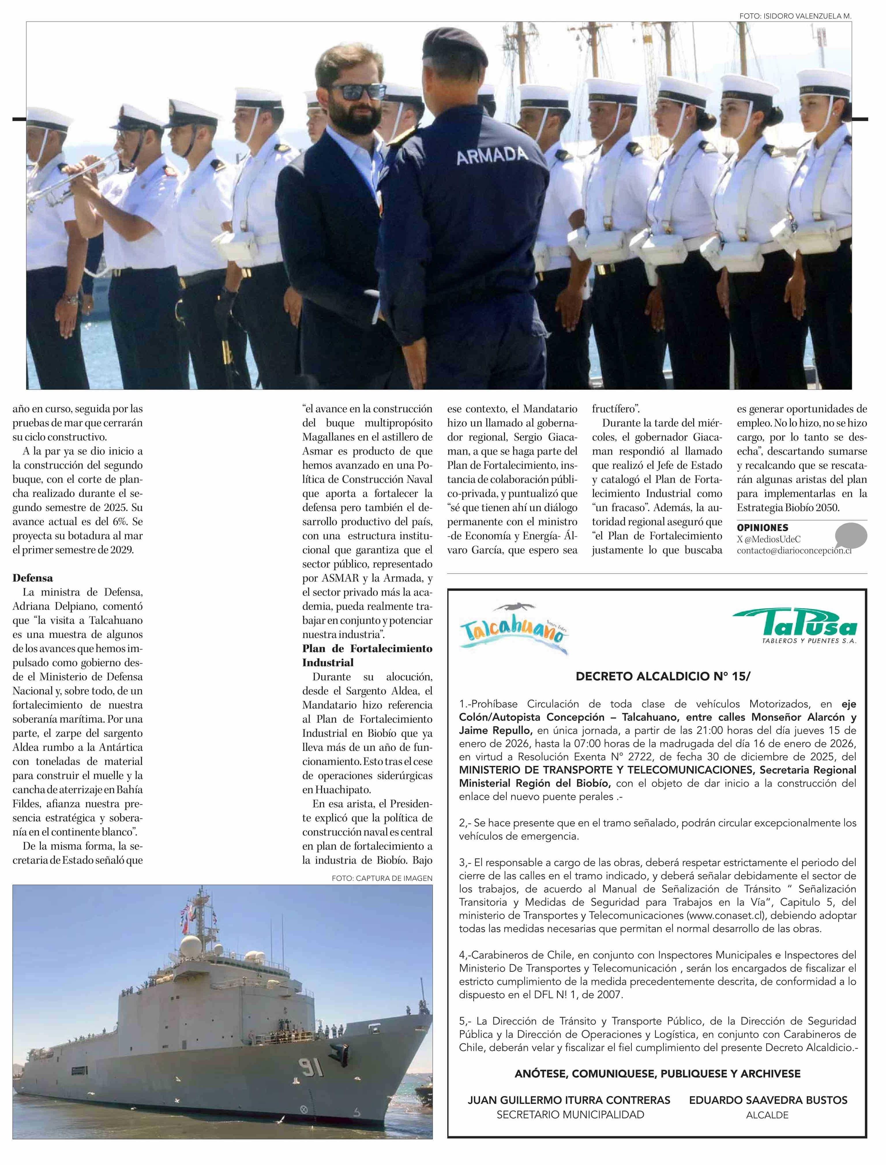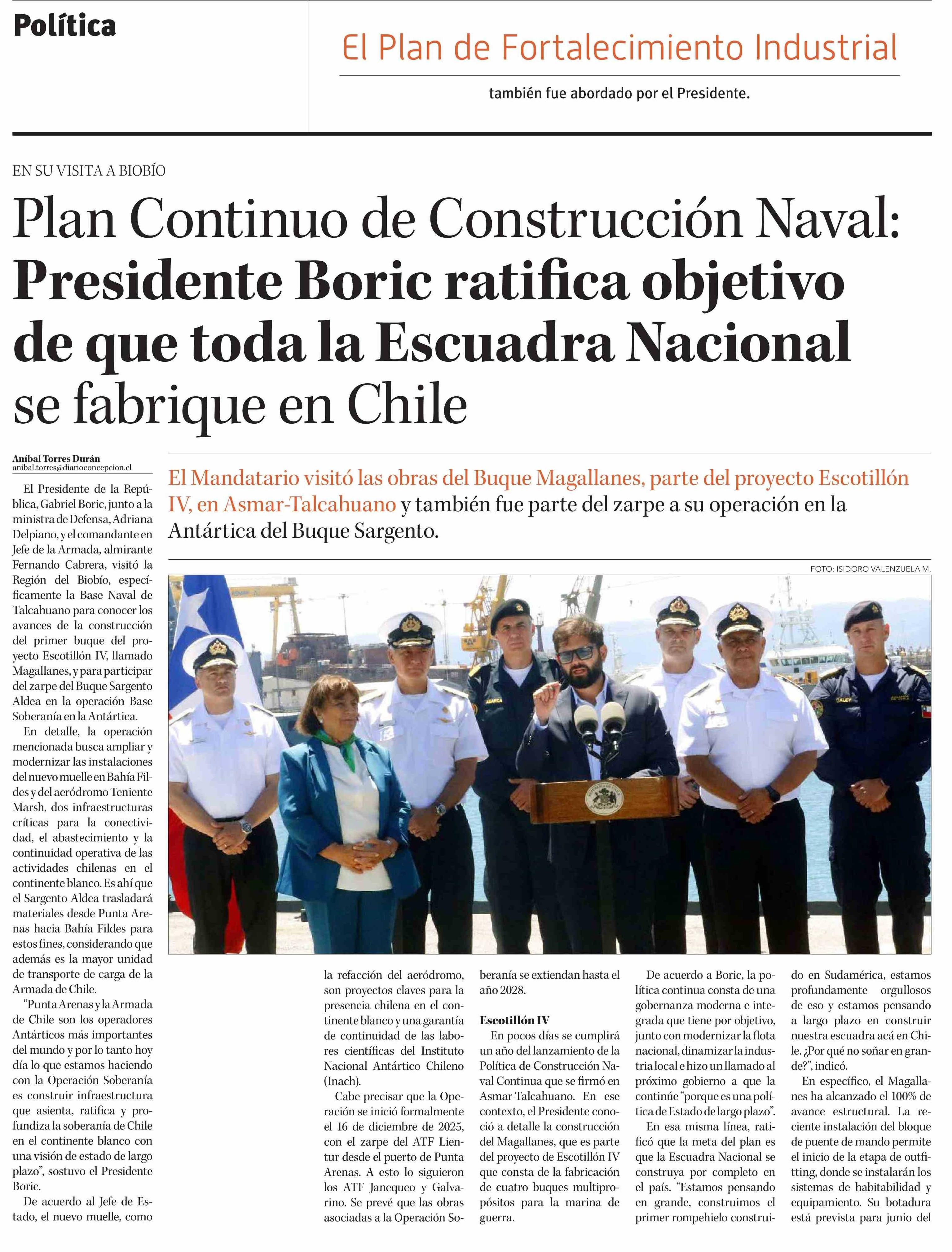 Plan Continuo de Construcción Naval: Presidente Boric ratifica objetivo de que toda la Escuadra Nacional se fabrique en Chile 15-01-2026 Diario Concepción |