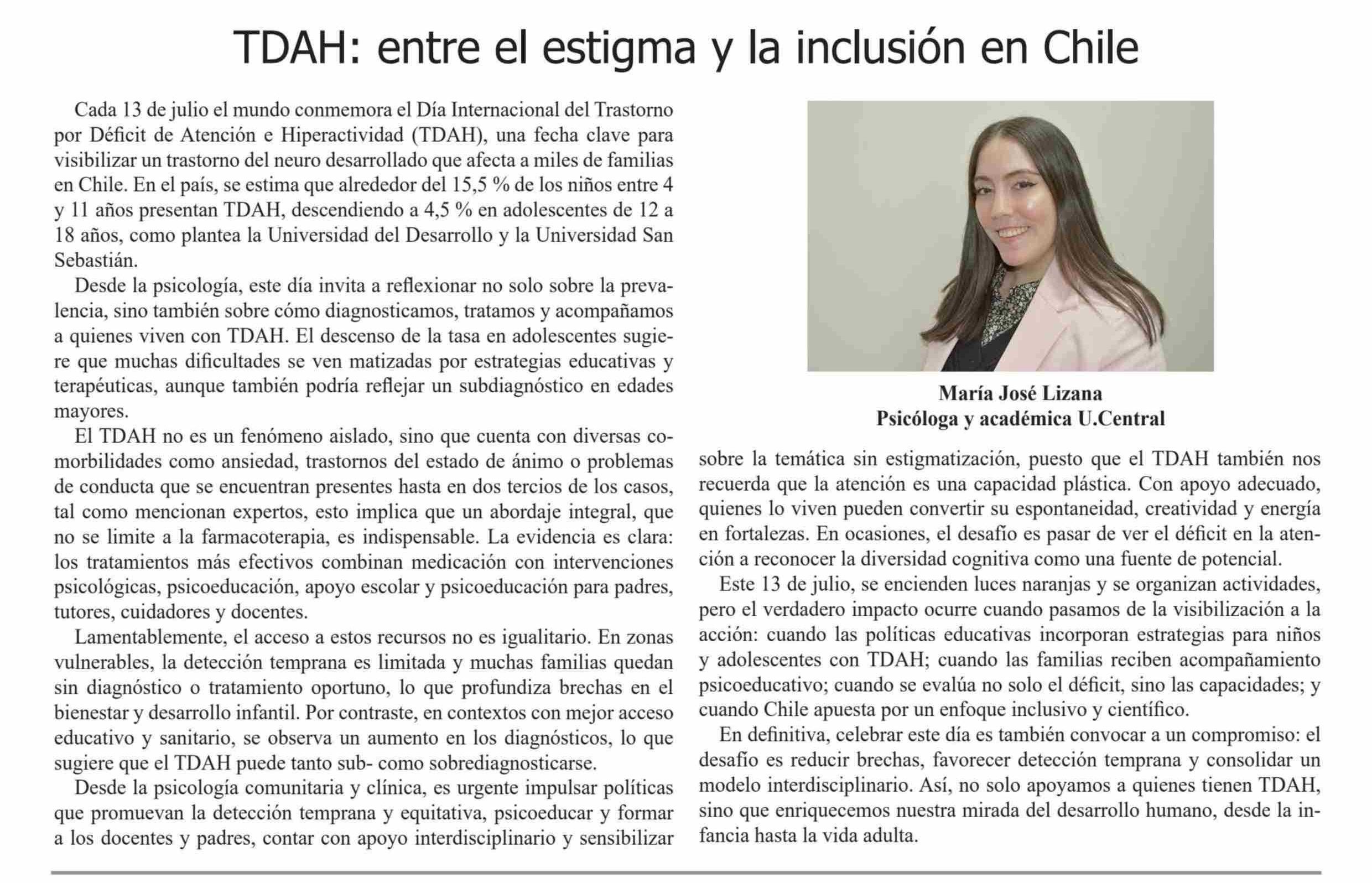 COLUMNAS DE OPINIÓN: TDAH: entre el estigma y la inclusión en Chile 11-07-2025 El Heraldo |