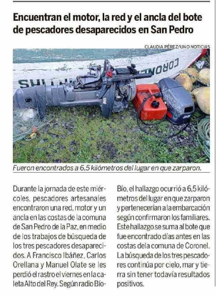 | Título: | Encuentran el motor, la red y el ancla del bote de pescadores desaparecidos en San Pedro |