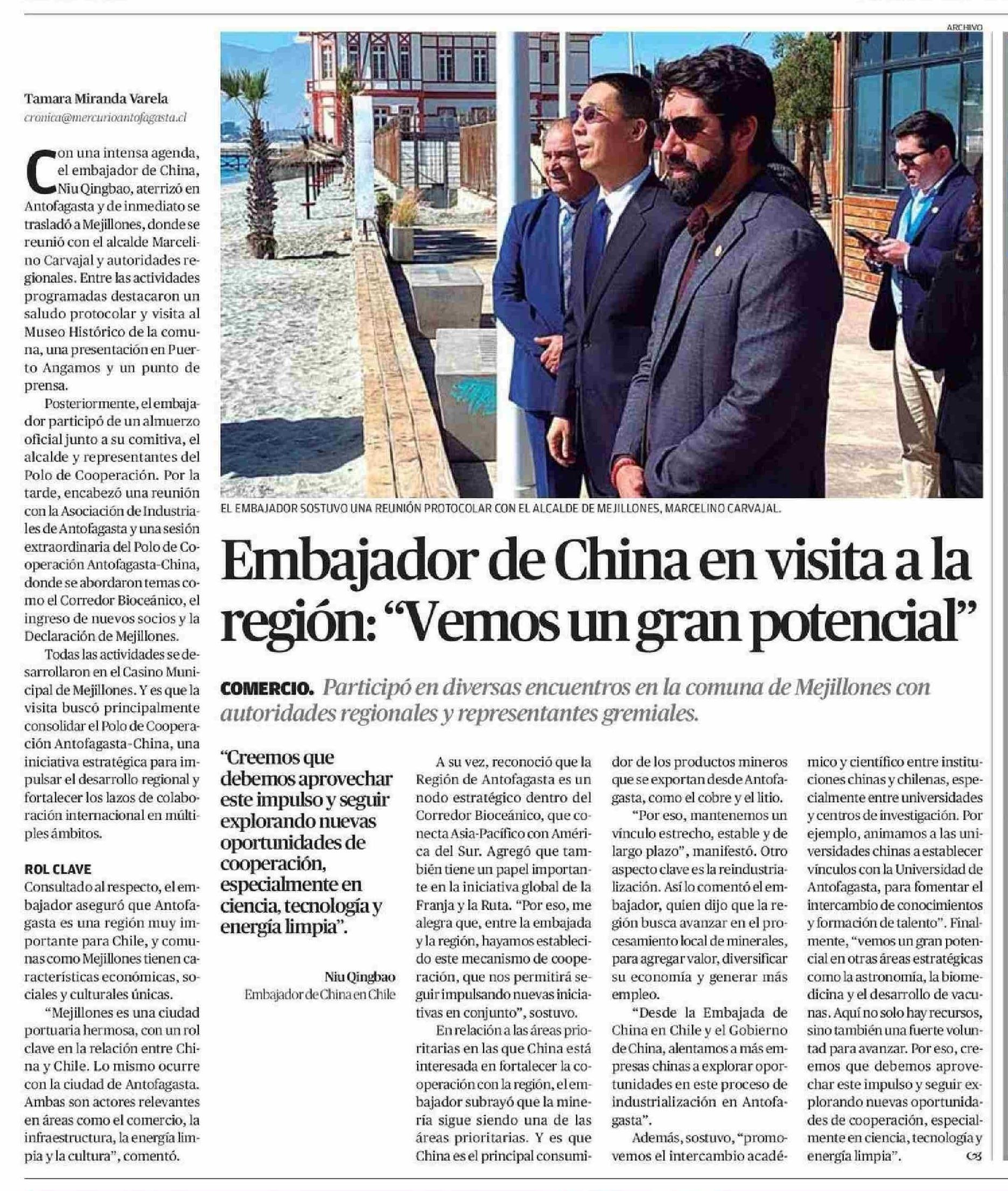 Embajador de China en visita a la región: "Vemos un gran potencial" 20-06-2025 El Mercurio de Calama |