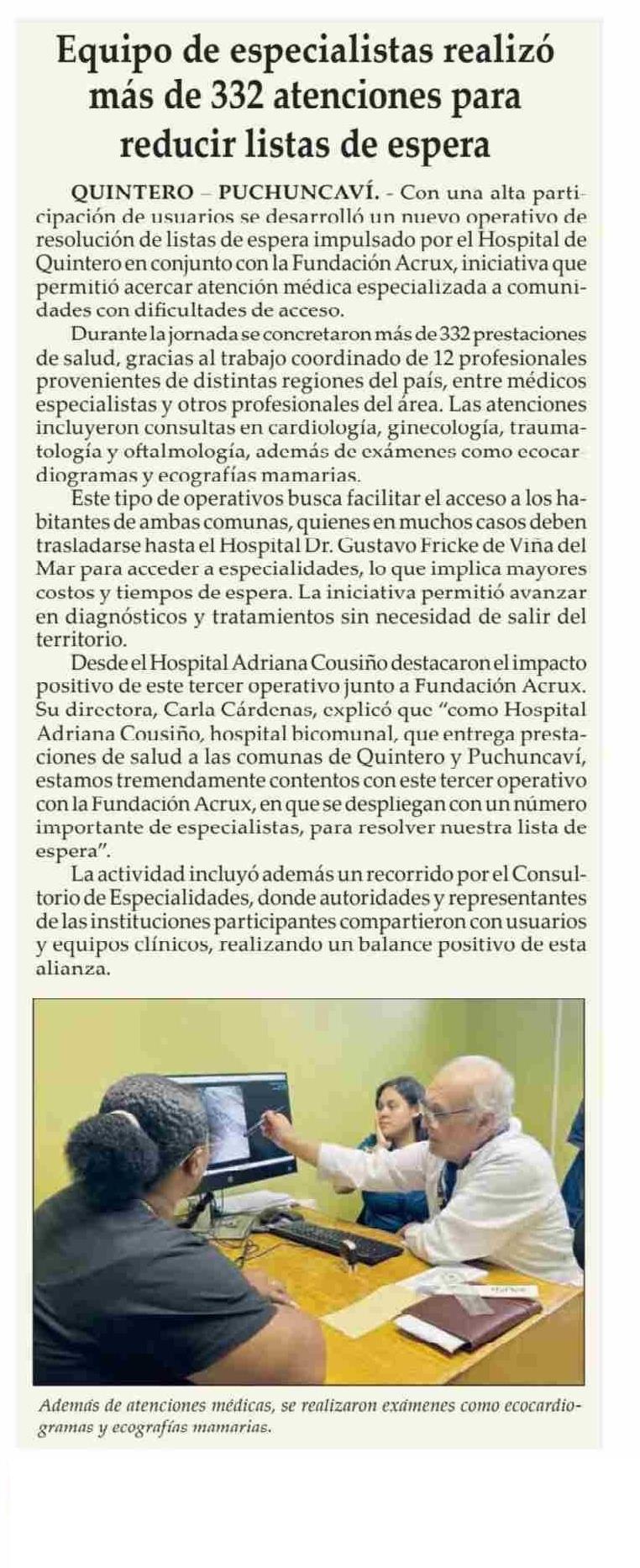 | Título: | Equipo de especialistas realizó más de 332 atenciones para reducir listas de espera |