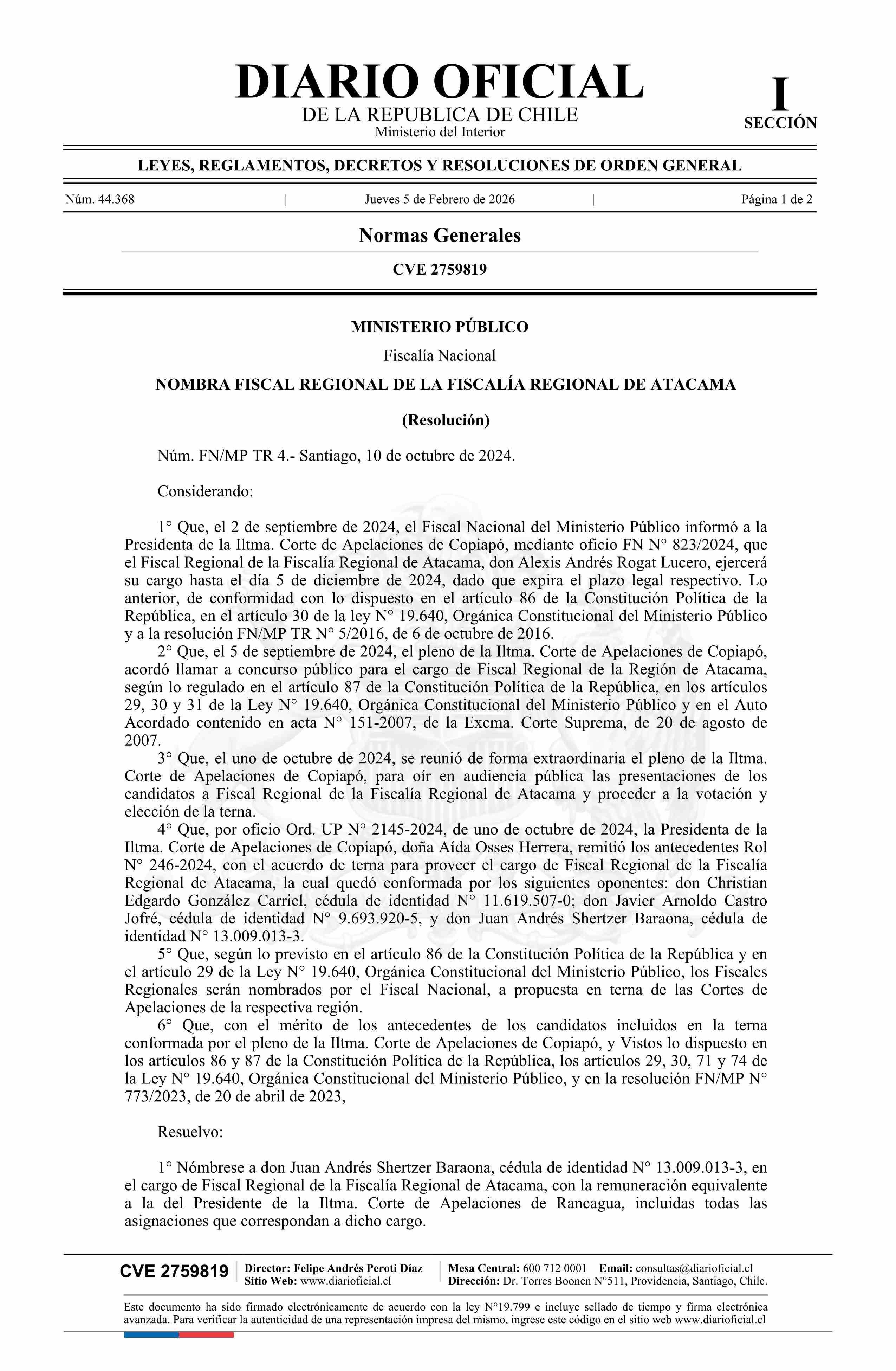Título: Resolución número TR 4, de 2024.- Nombra a don Juan Andrés Shertzer Baraona en el cargo de Fiscal Regional de la Fiscalía Regional de Atacama