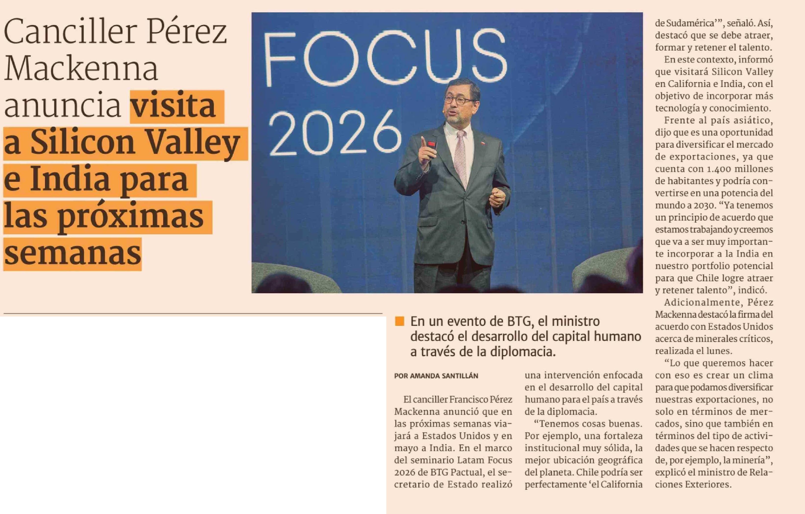 Título: Canciller Pérez Mackenna anuncia visita a Silicon Valley e India para las próximas semanas