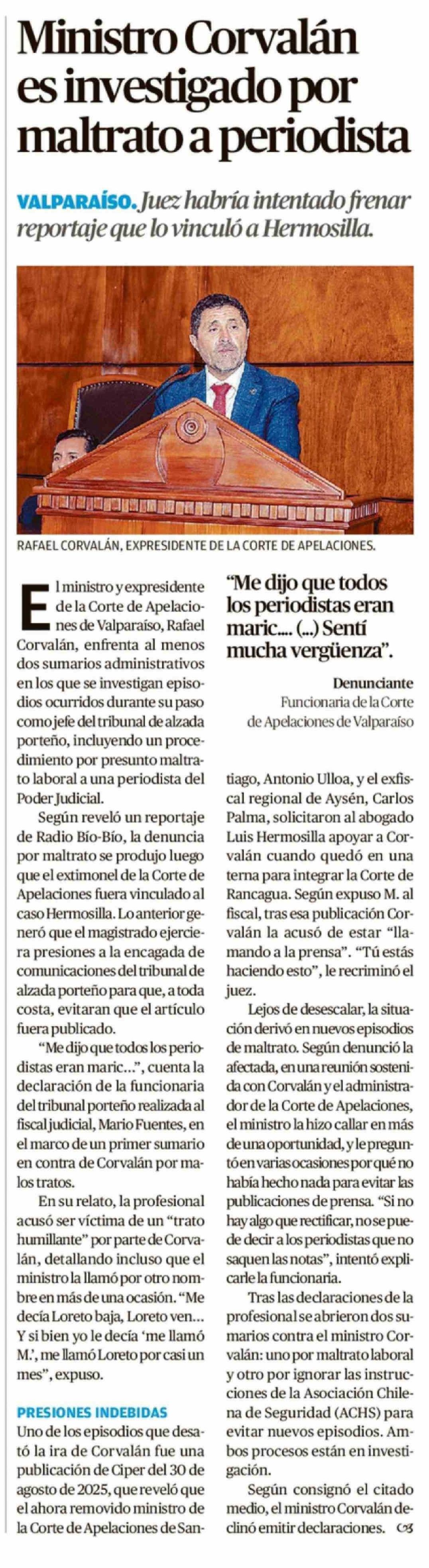 Ministro Corvalán es investigado por maltrato a periodista 18-03-2026 El Mercurio de Valparaíso |