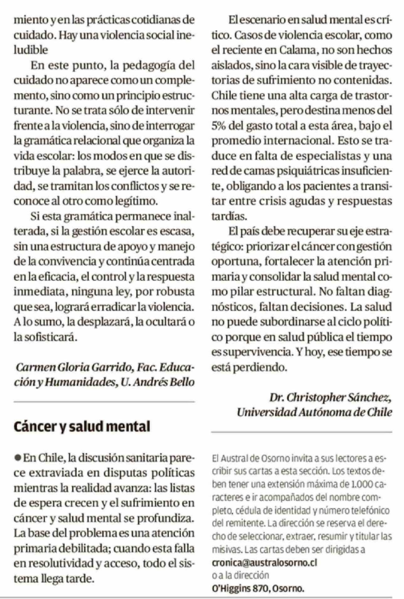 Cartas: Cáncer y salud mental 08-04-2026 El Austral de Osorno |