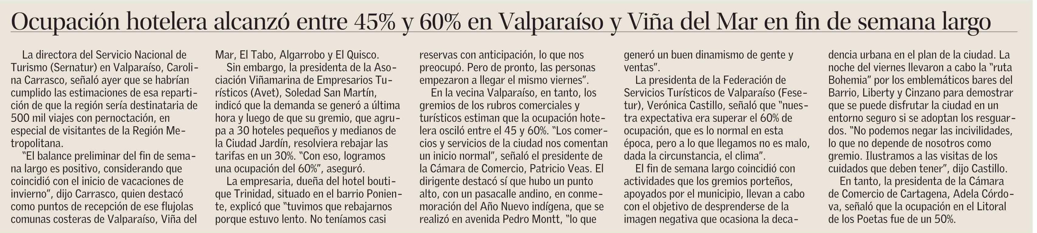 Ocupación hotelera alcanzó entre 45% y 60% en Valparaíso y Viña del Mar en fin de semana largo 23-06-2025 El Mercurio |