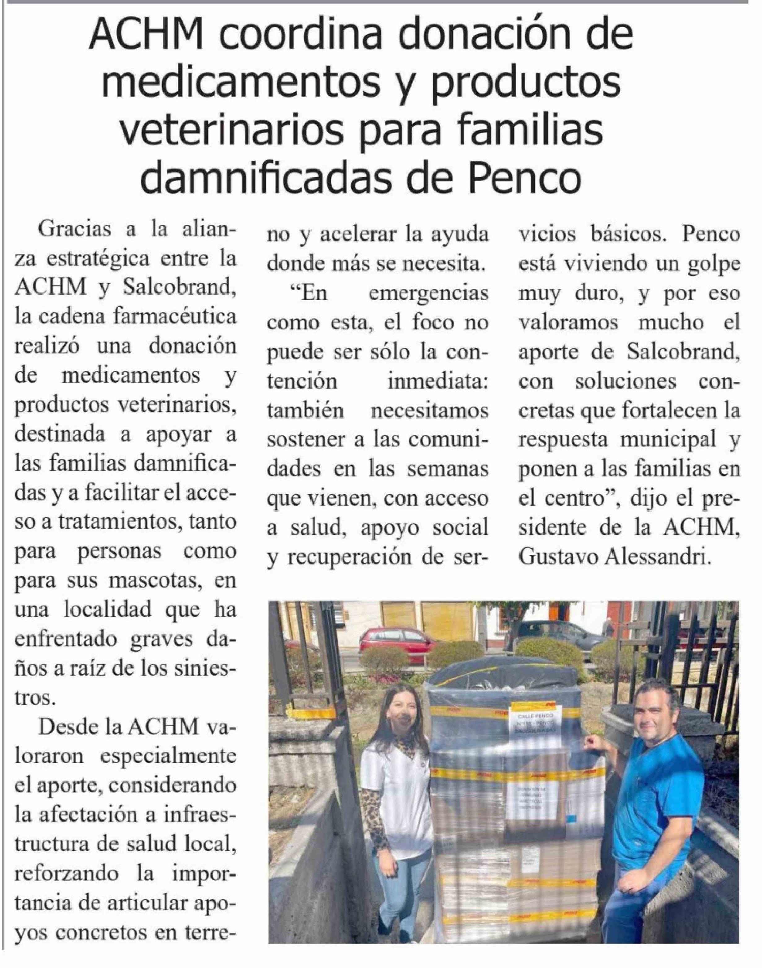| Título: | ACHM coordina donación de medicamentos y productos veterinarios para familias damnificadas de Penco |