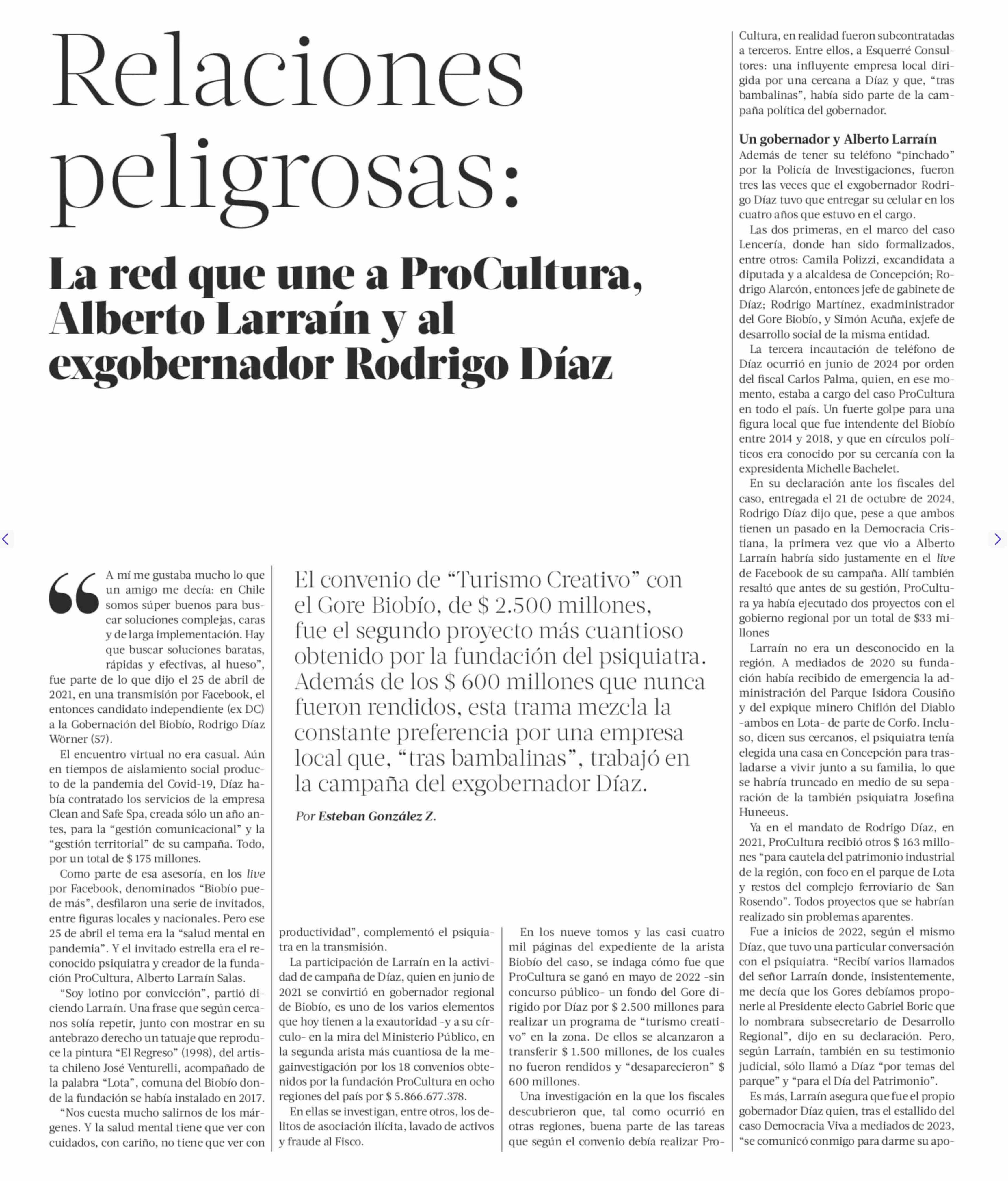 | Título: | Relaciones peligrosas: La red que une a ProCultura, Alberto Larraín y al exgobernador Rodrigo Díaz |