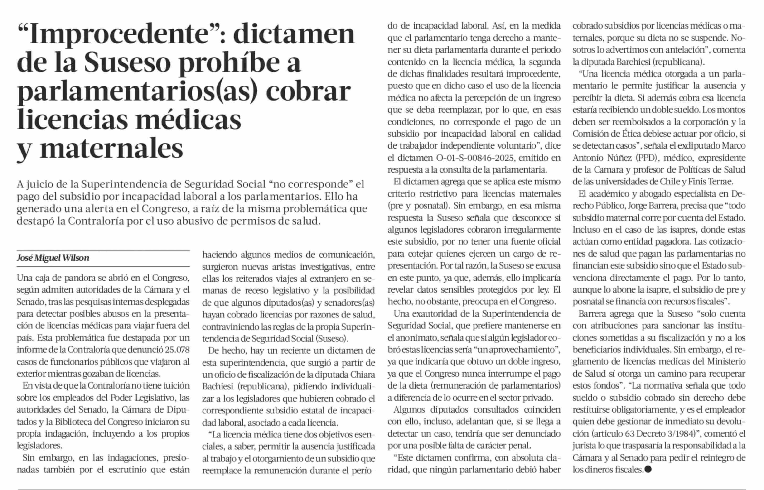 Título: “Improcedente”: dictamen de la Suseso prohíbe a parlamentarios(as) cobrar licencias médicas y maternales