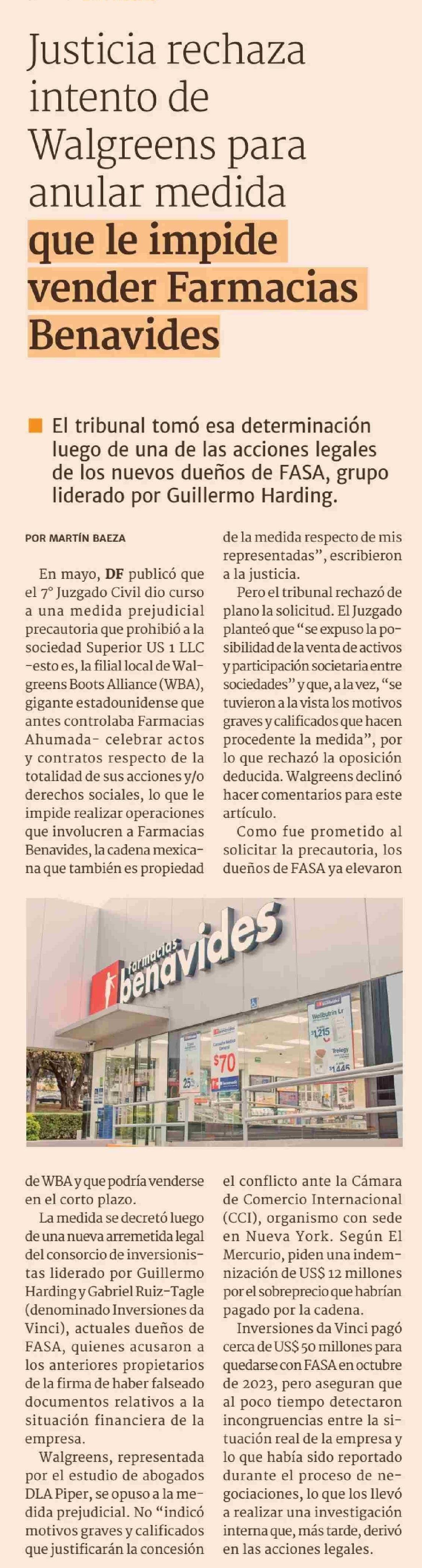 Justicia rechaza intento de Walgreens para anular medida que le impide vender Farmacias Benavides 13-06-2025 Diario Financiero |