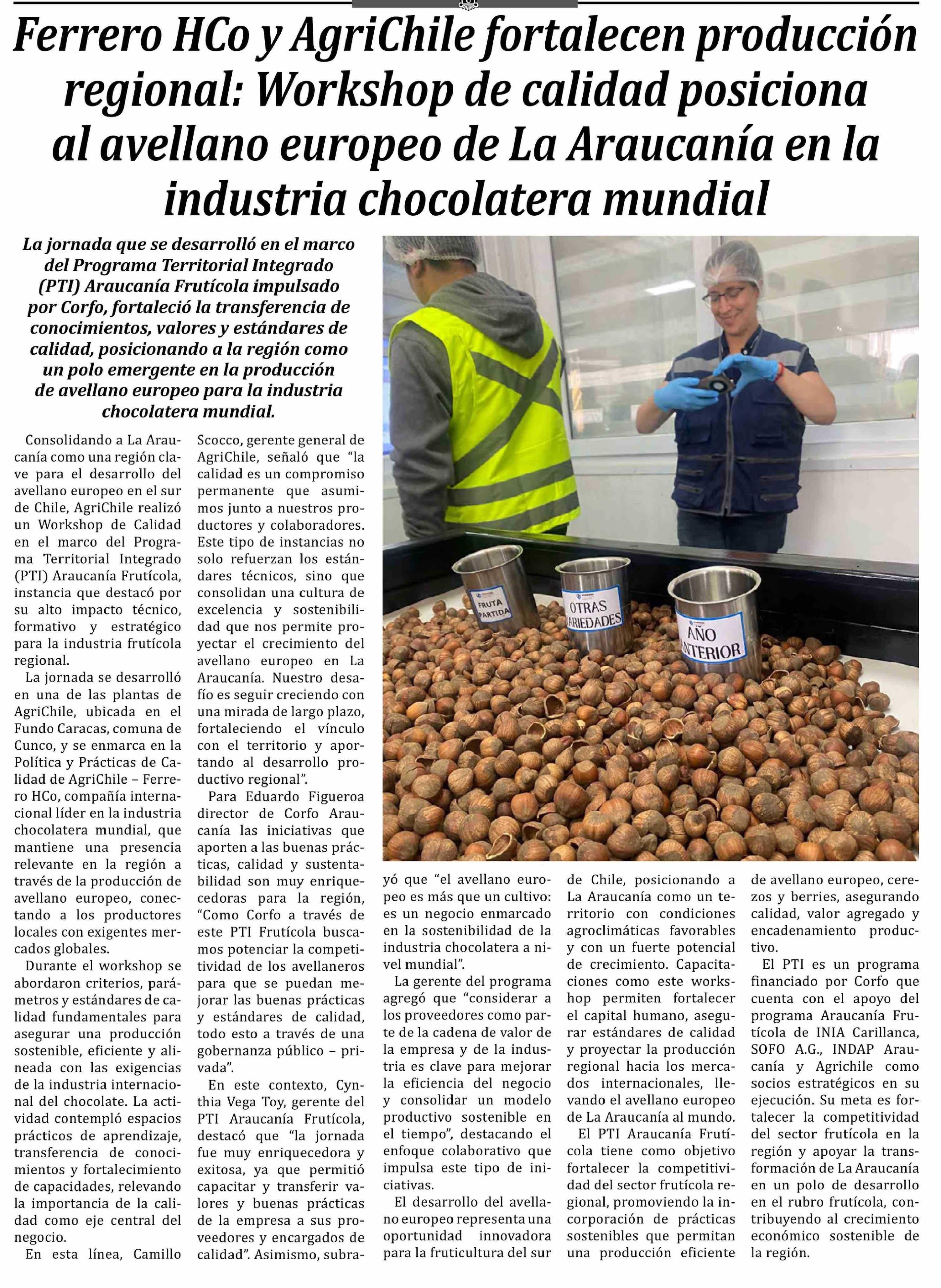 | Título: | Ferrero HCo y AgriChile fortalecen producción regional: Workshop de calidad posiciona al avellano europeo de La Araucanía en la industria chocolatera mundial |