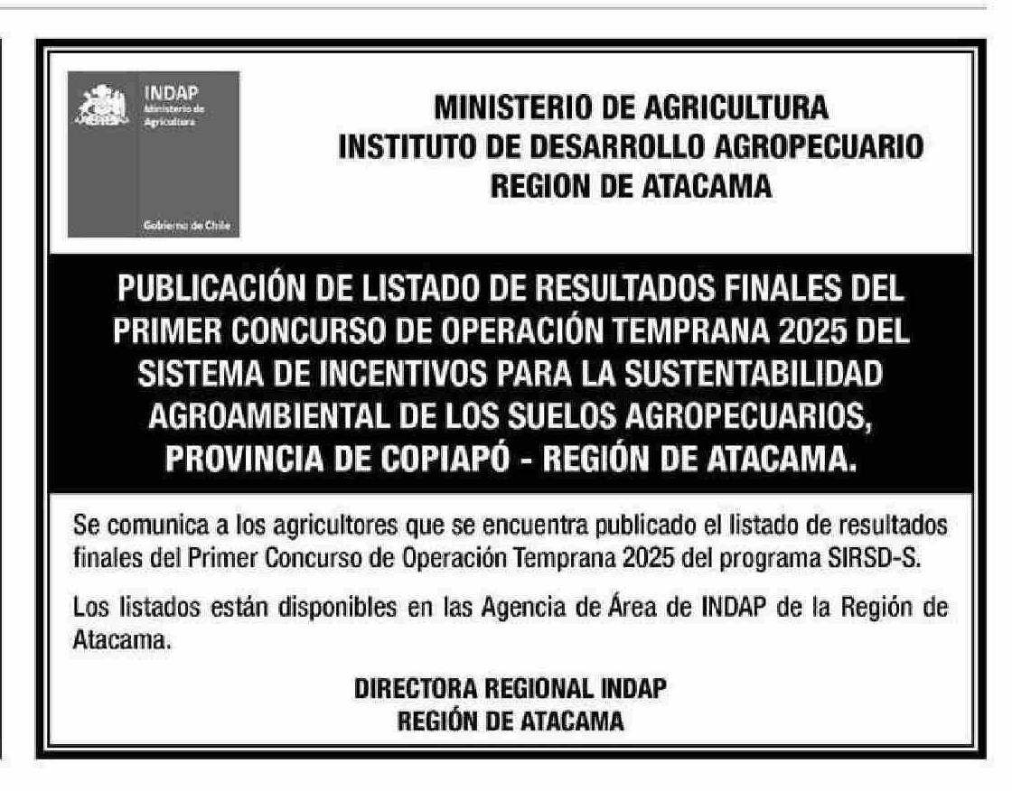 Extractos: MINISTERIO DE AGRICULTURA INSTITUTO DE DESARROLLO AGROPECUARIO REGION DE ATACAMA 27-05-2025 El Diario de Atacama |