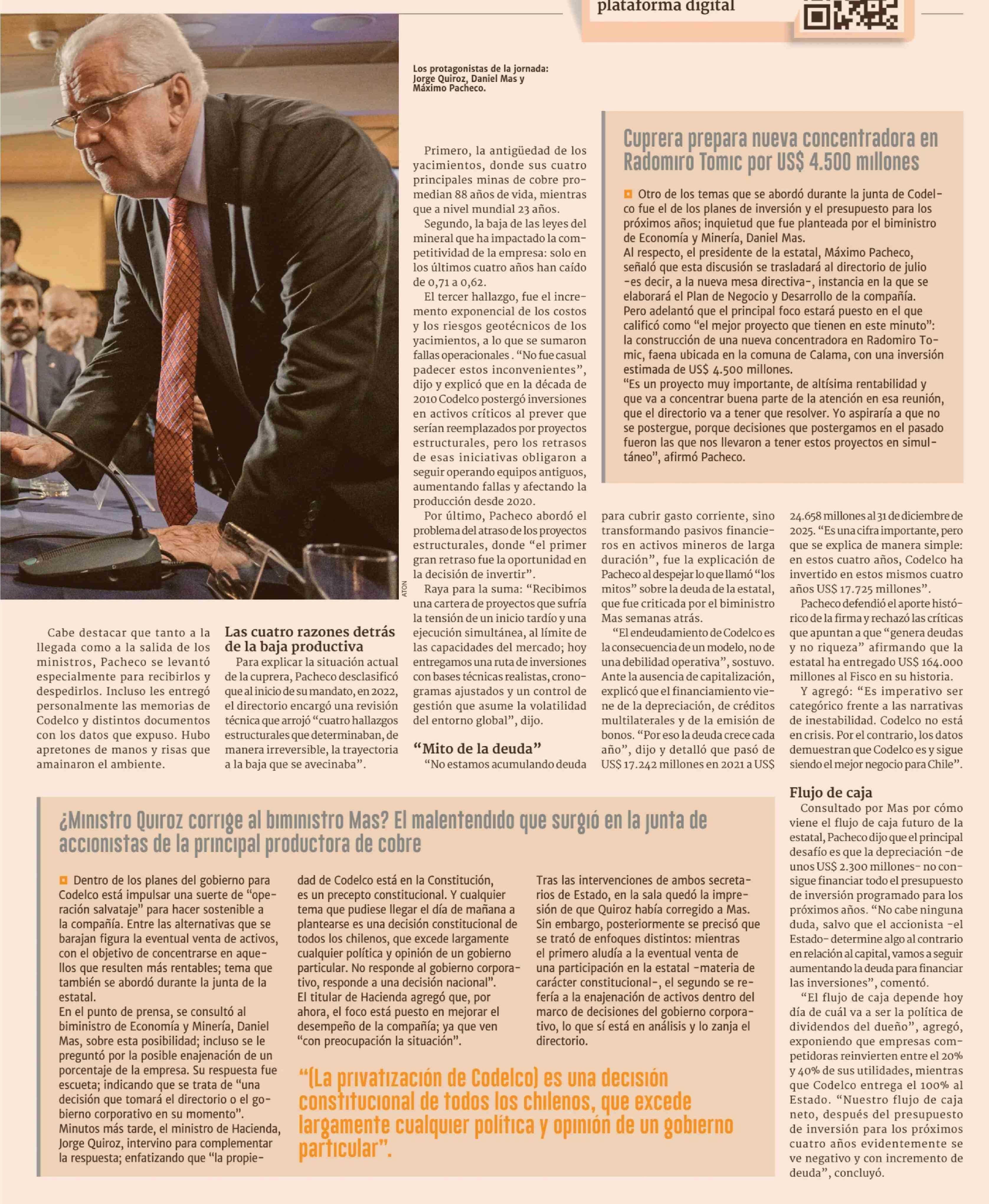 Alta tensión en junta de Codelco: Pacheco defiende que "no hay crisis" y Quiroz exige autocrítica 21-04-2026 Diario Financiero |